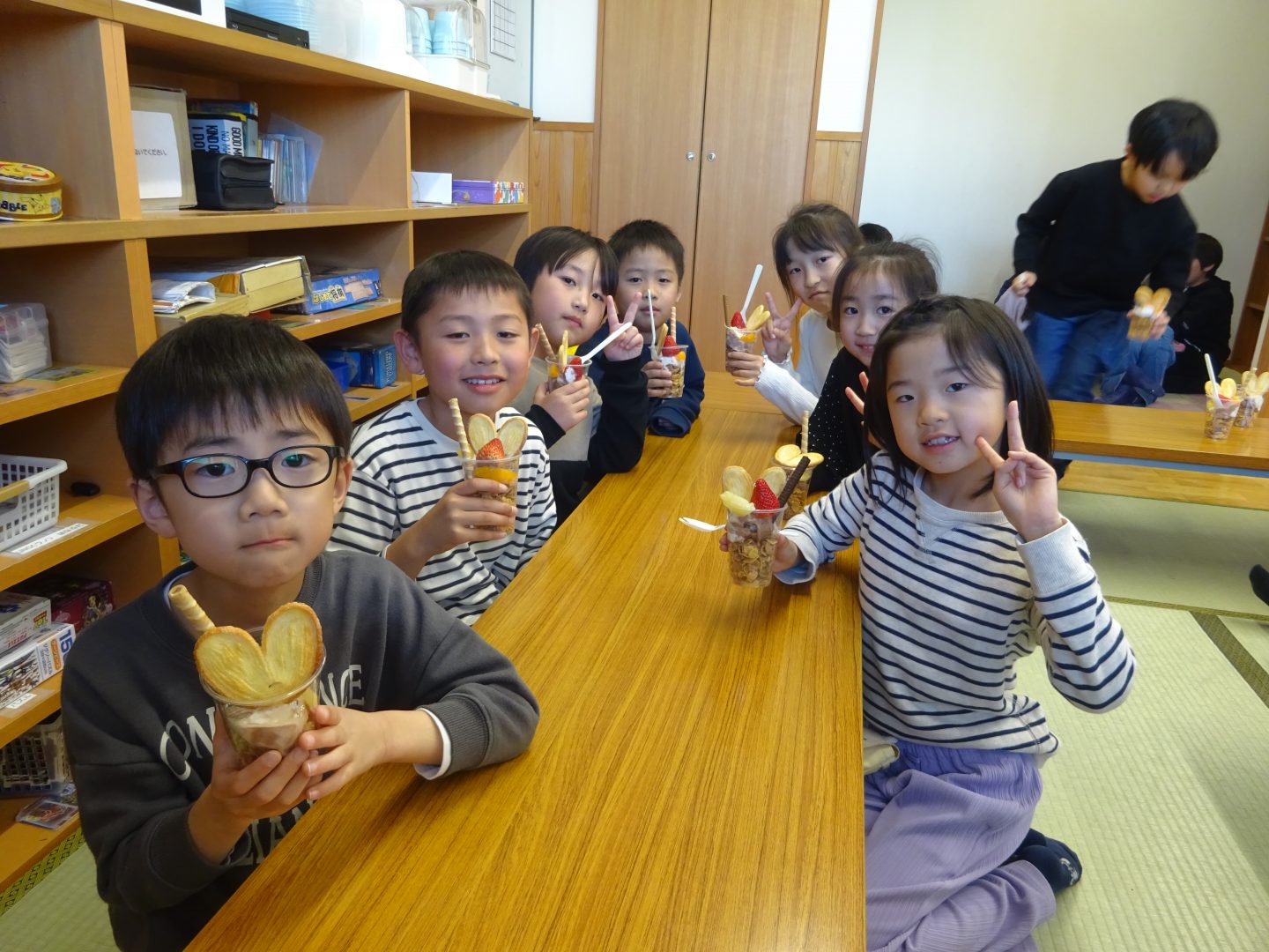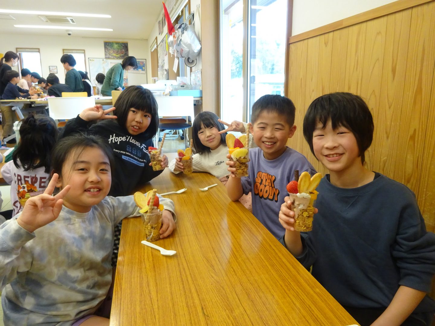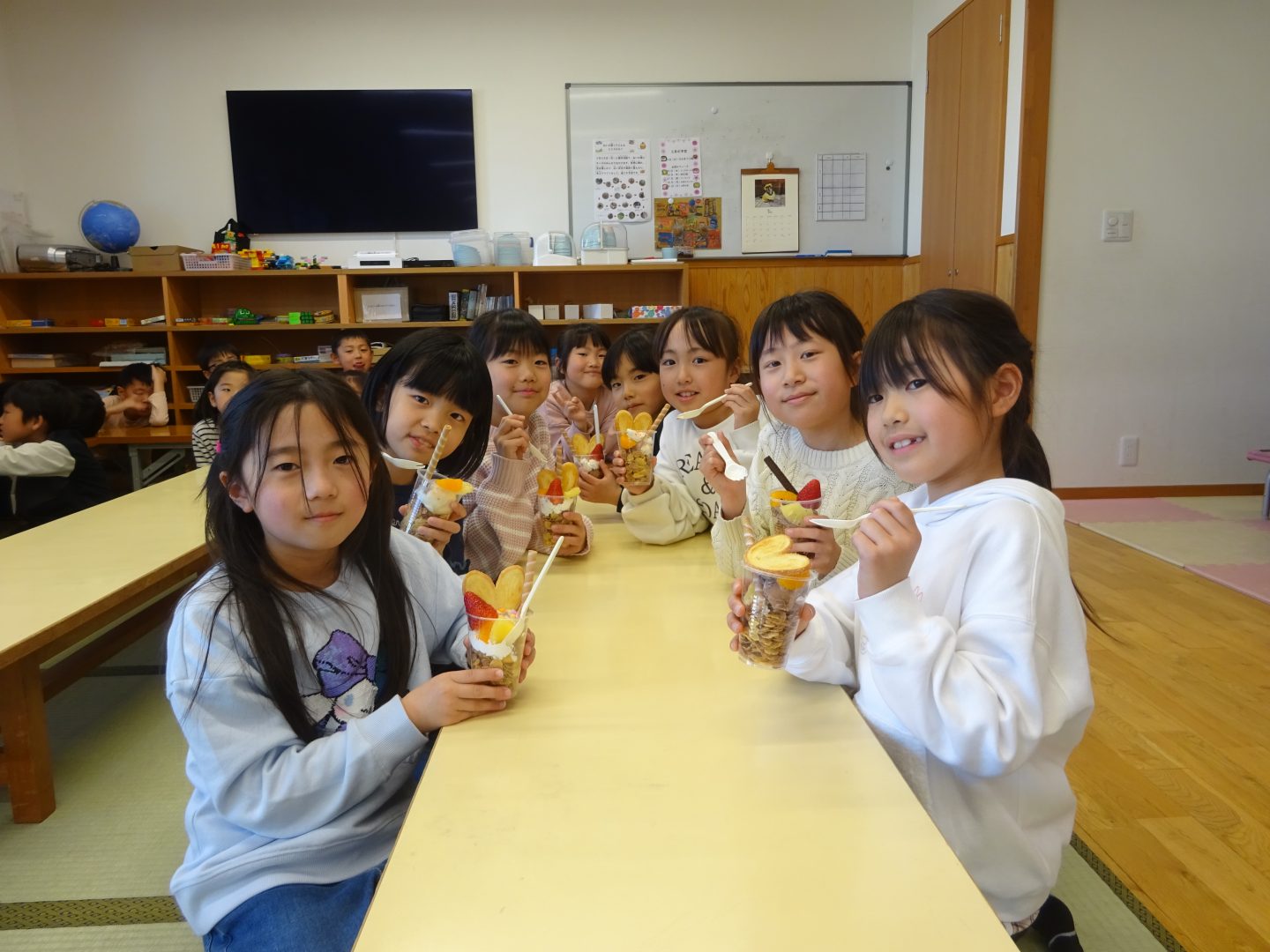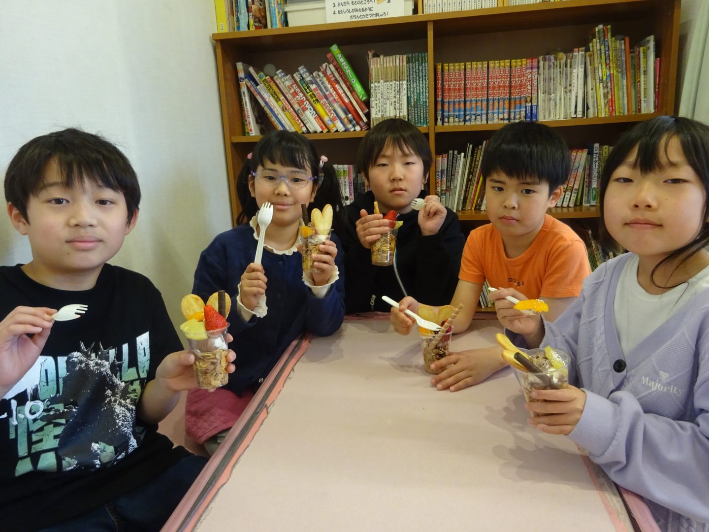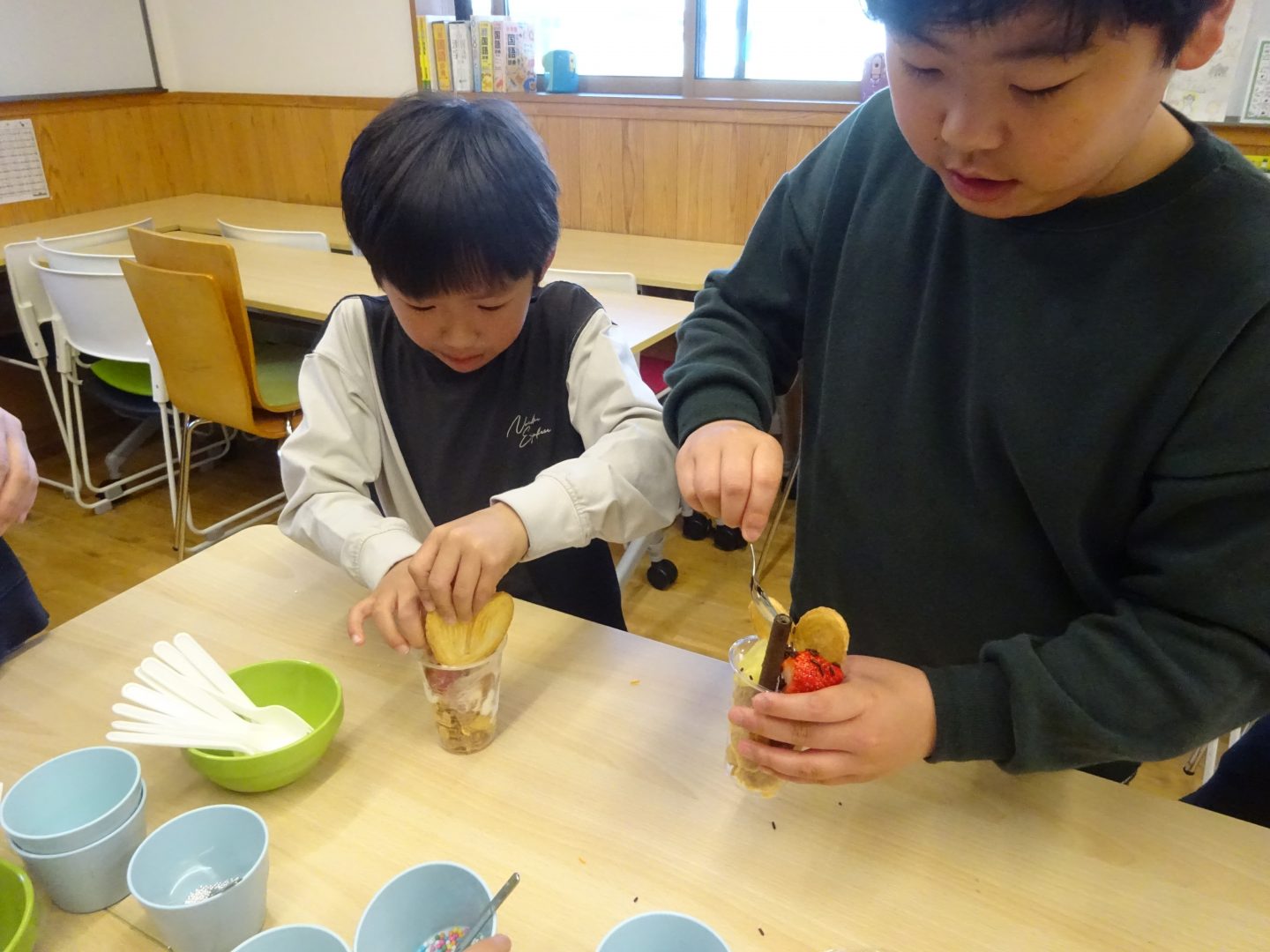 3月27日(金)お別れウィーク3日目、”デコレーションパフェ”を作りました。事前に2.3年生と買い出しにでかけ、材料を準備しました。今回はいつもより、少し豪華に『いちご』もトッピング!「わあ~、かわいい!」「食べるのもったいないな~!」と、楽しい会話が聞こえてきました。友達と食べるおやつは、格別ですね!さて、4日目は2年生企画お別れセレモニーです。また、このブログでお伝えしますね。