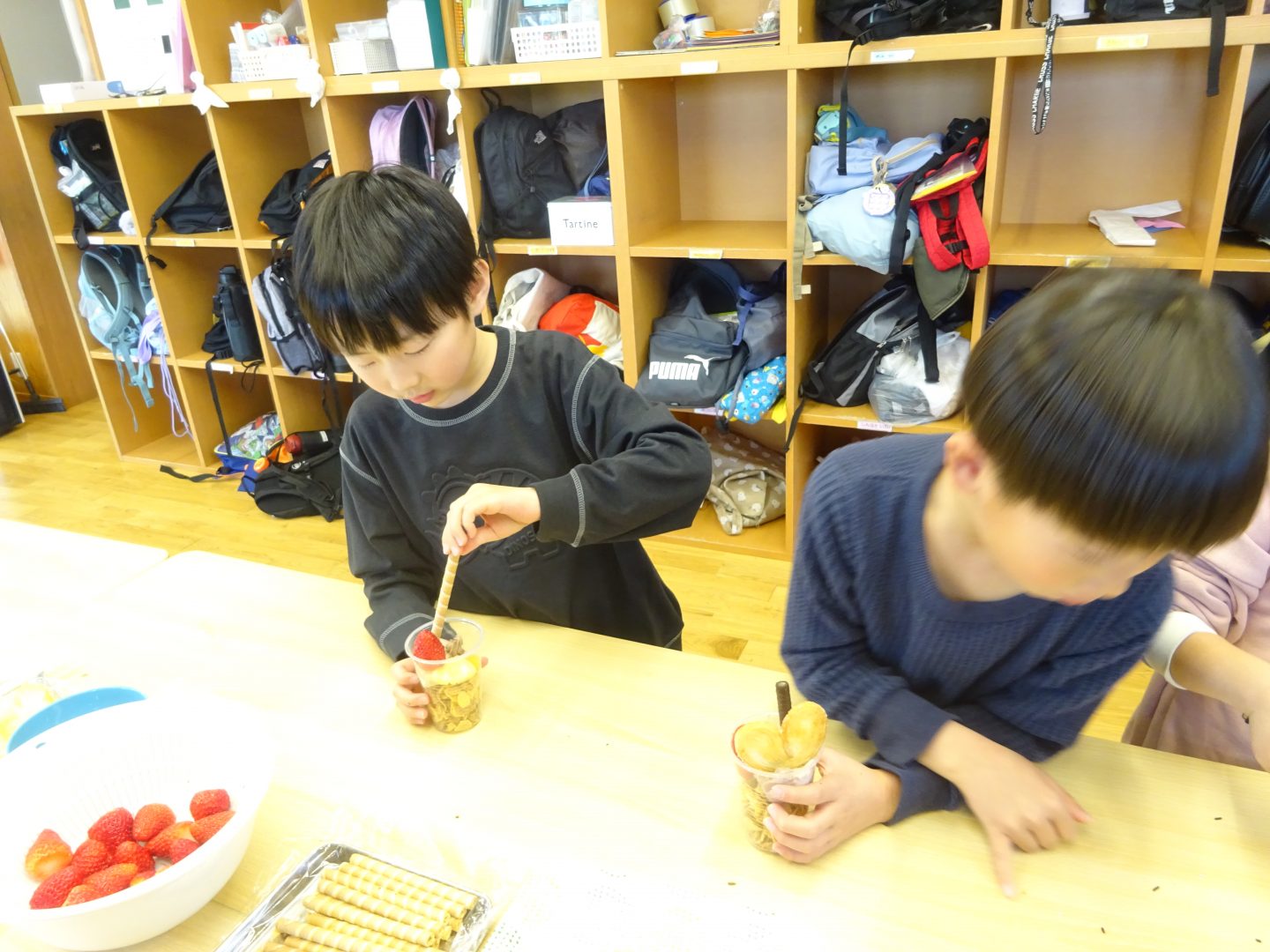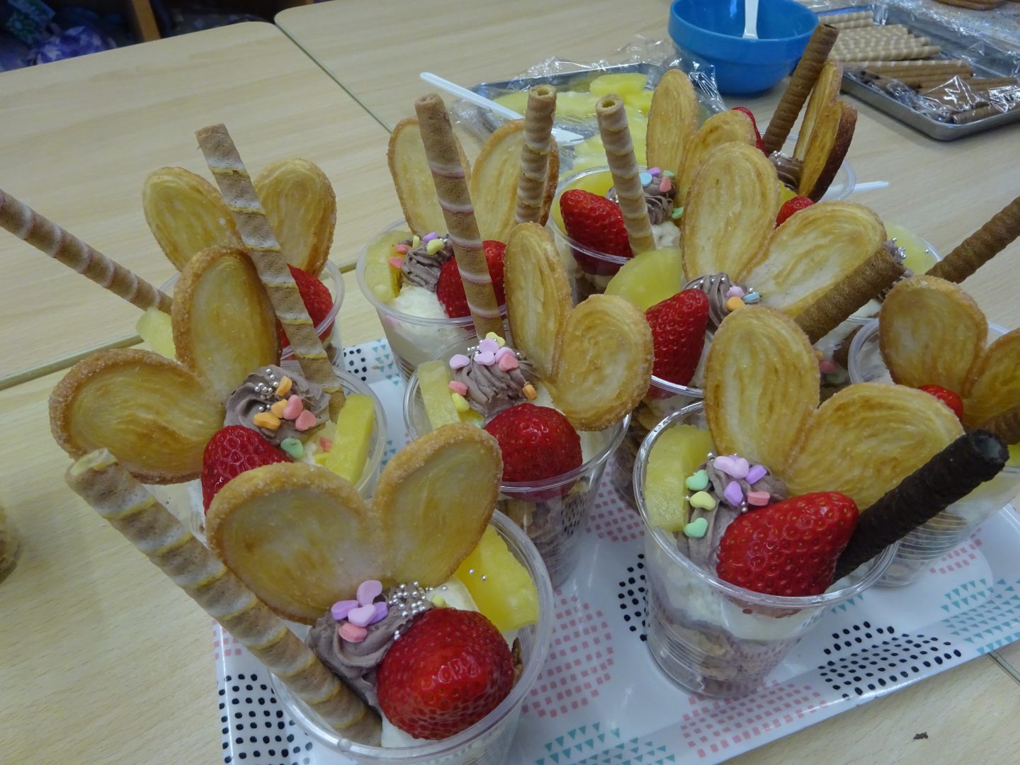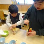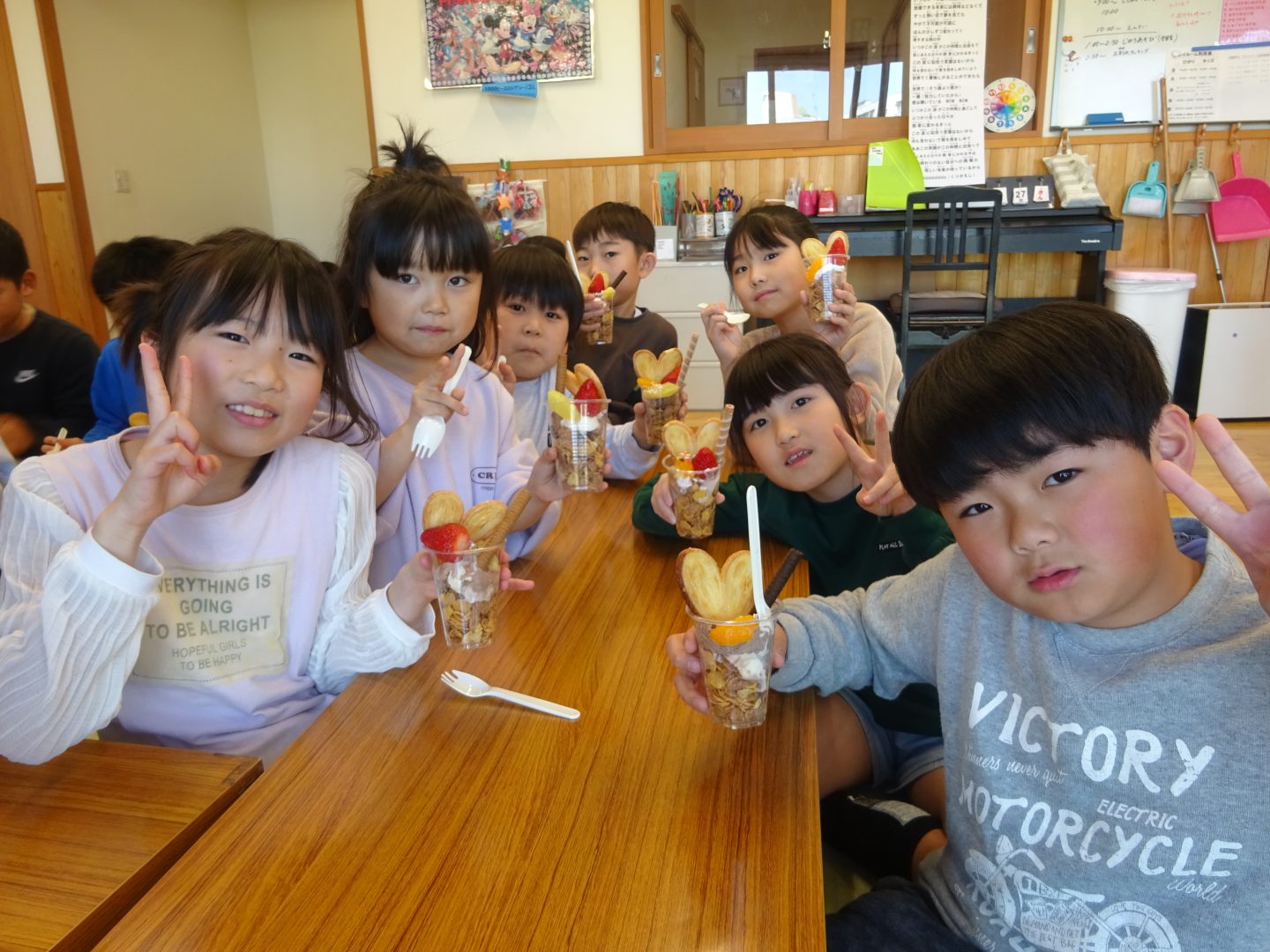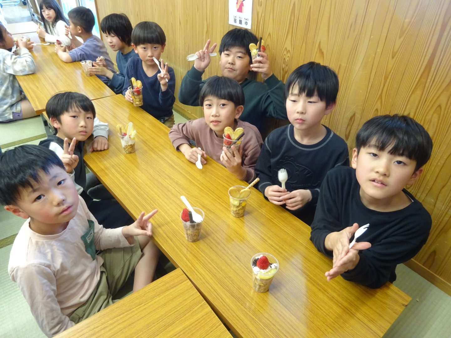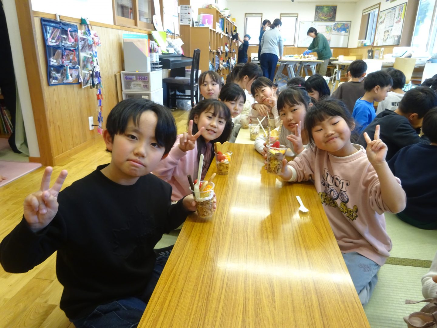 3月27日(金)お別れウィーク3日目、”デコレーションパフェ”を作りました。事前に2.3年生と買い出しにでかけ、材料を準備しました。今回はいつもより、少し豪華に『いちご』もトッピング!「わあ~、かわいい!」「食べるのもったいないな~!」と、楽しい会話が聞こえてきました。友達と食べるおやつは、格別ですね!さて、4日目は2年生企画お別れセレモニーです。また、このブログでお伝えしますね。