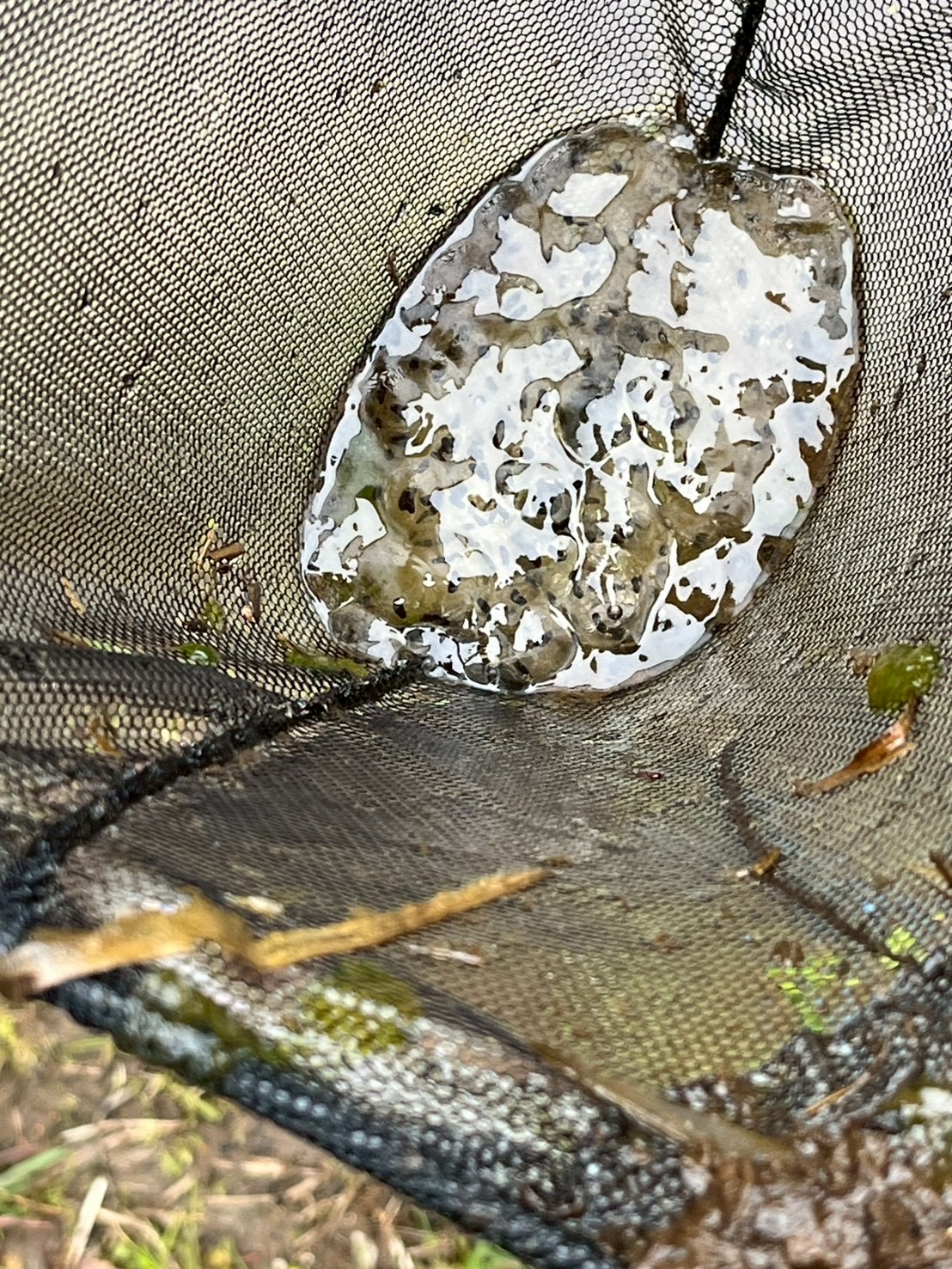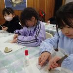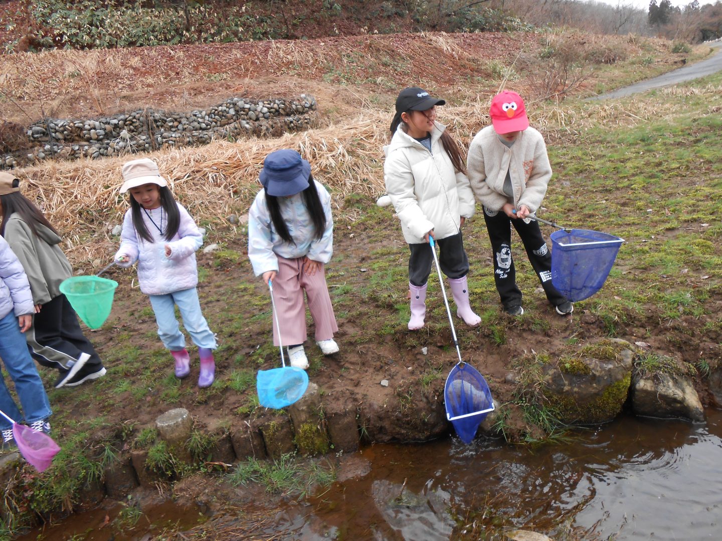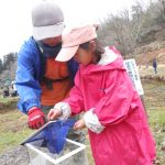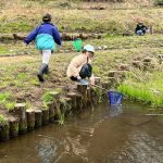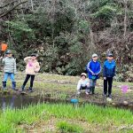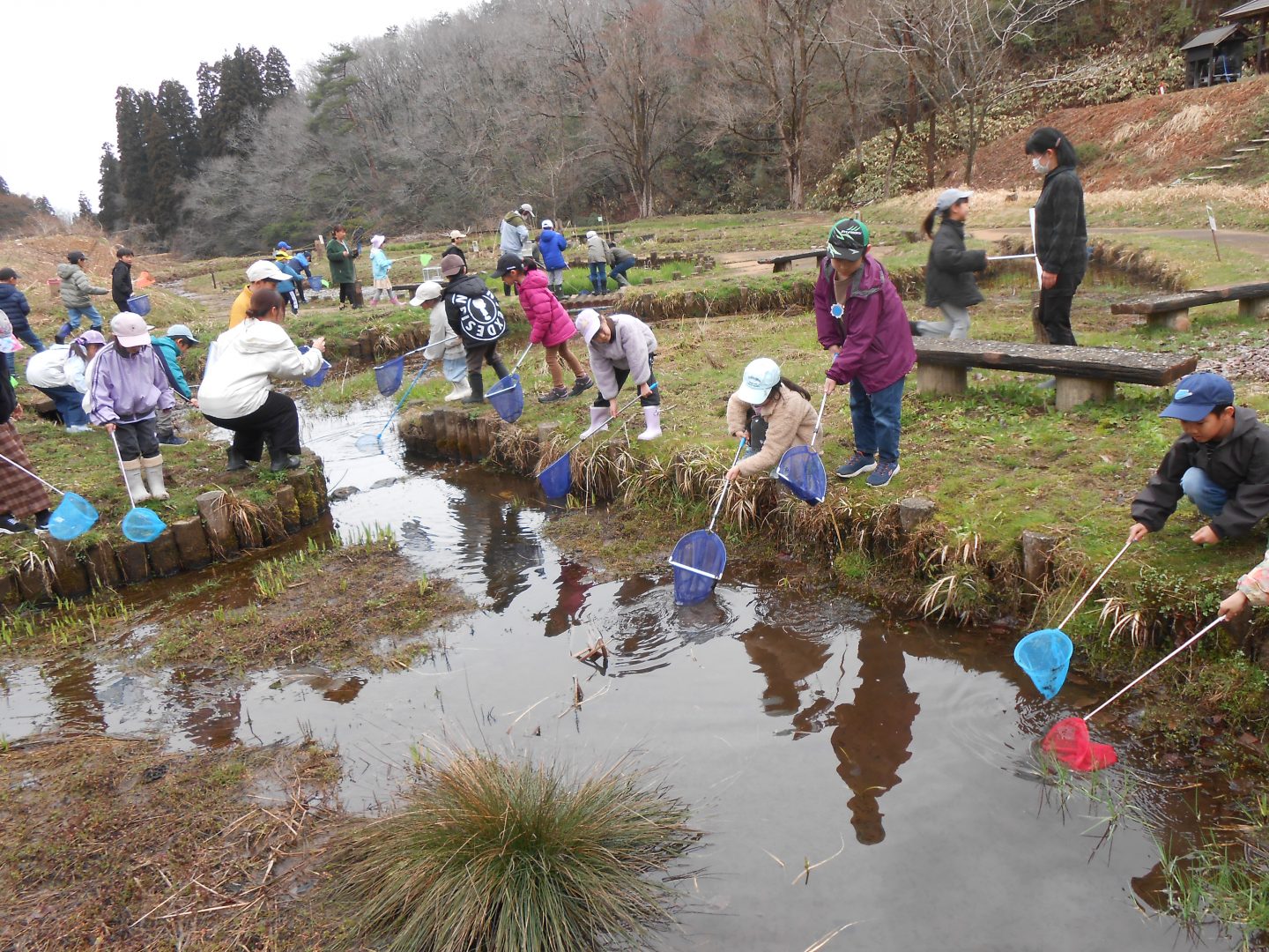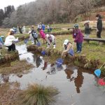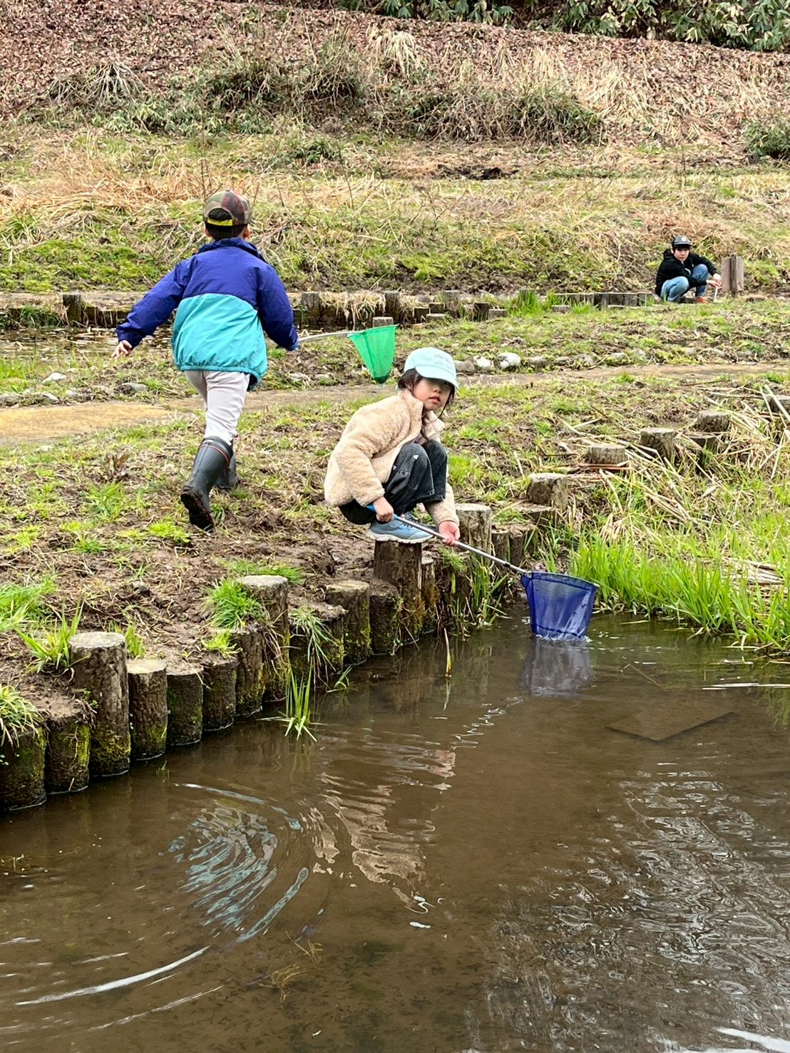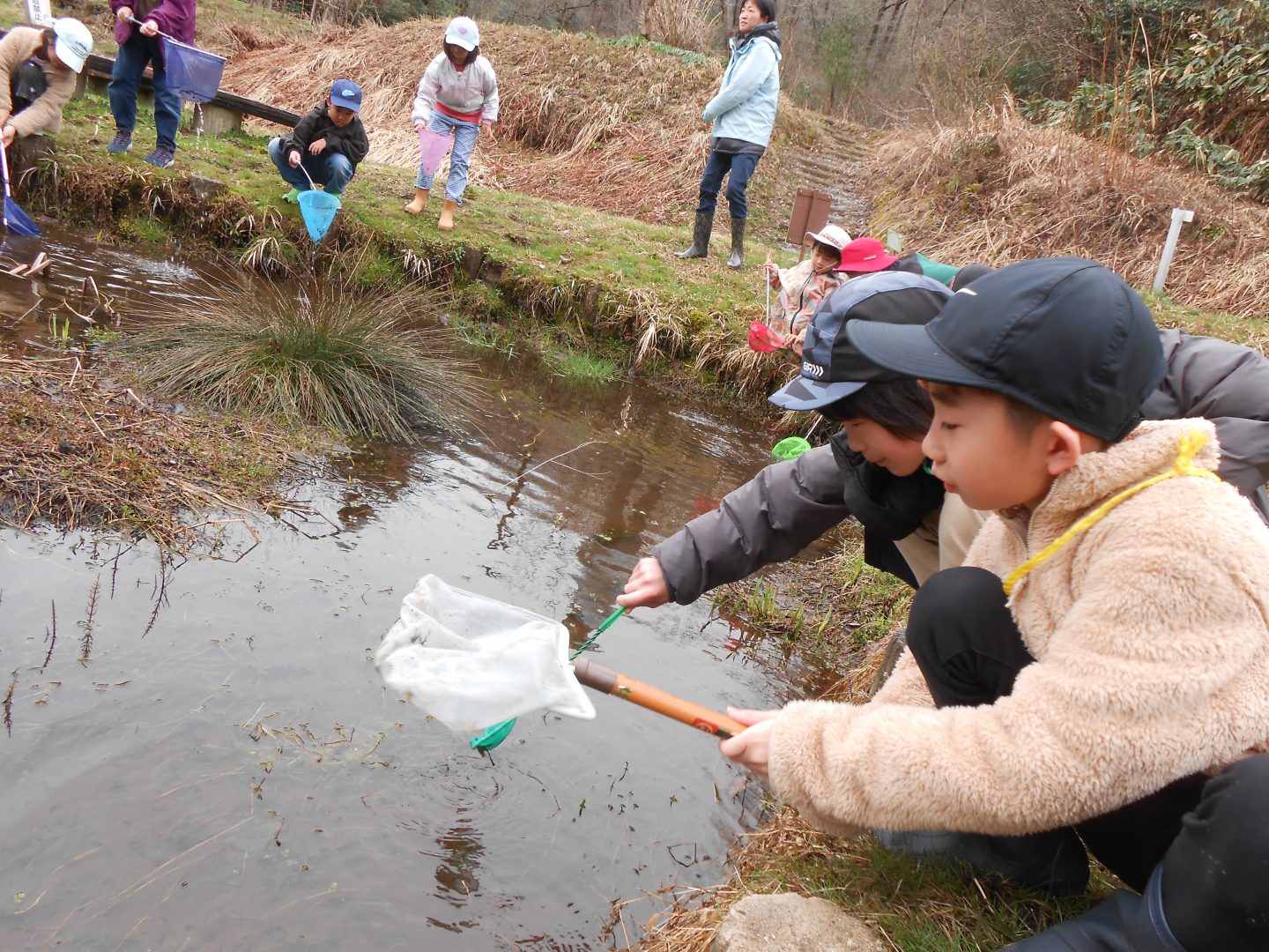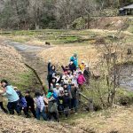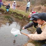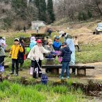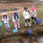 お弁当を食べた後は、みんなで『春の水辺で生き物探し』へレッツゴー!施設の方に、網を一人一つずつ貸してもらい、池の中にいる生き物をそれぞれに見つけていました。網をすくうと、中にはおたまじゃくしが10匹ほど!「わあ~たくさんいる!」「みてみて!おたまじゃくしのたまごだ~!」初めて見るたまごに興味津々の子どもたち。「ゼリーみたいだ!ふにゃふにゃしてる!」と、実際に触らせてもらったり、めだかを捕まえたりしながら、自然体験をたくさん経験させてもらいました。捕まえた後は、池に戻して、「元気なカエルになってね!」と、サヨナラしました。沢山の生き物に触れ、命の尊さを少しでも感じてくれたらと思います。