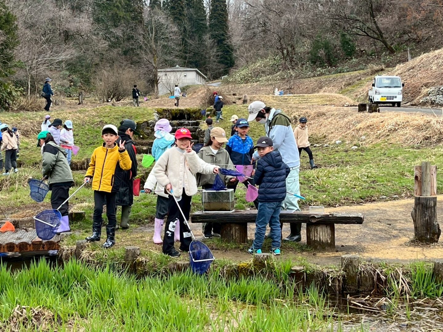 3月27日(木)課外活動で『ねいの里』へ行ってきました。朝は僅かな雨が降っていましたが、ねいの里に到着するころには、曇り空に変わっていました。