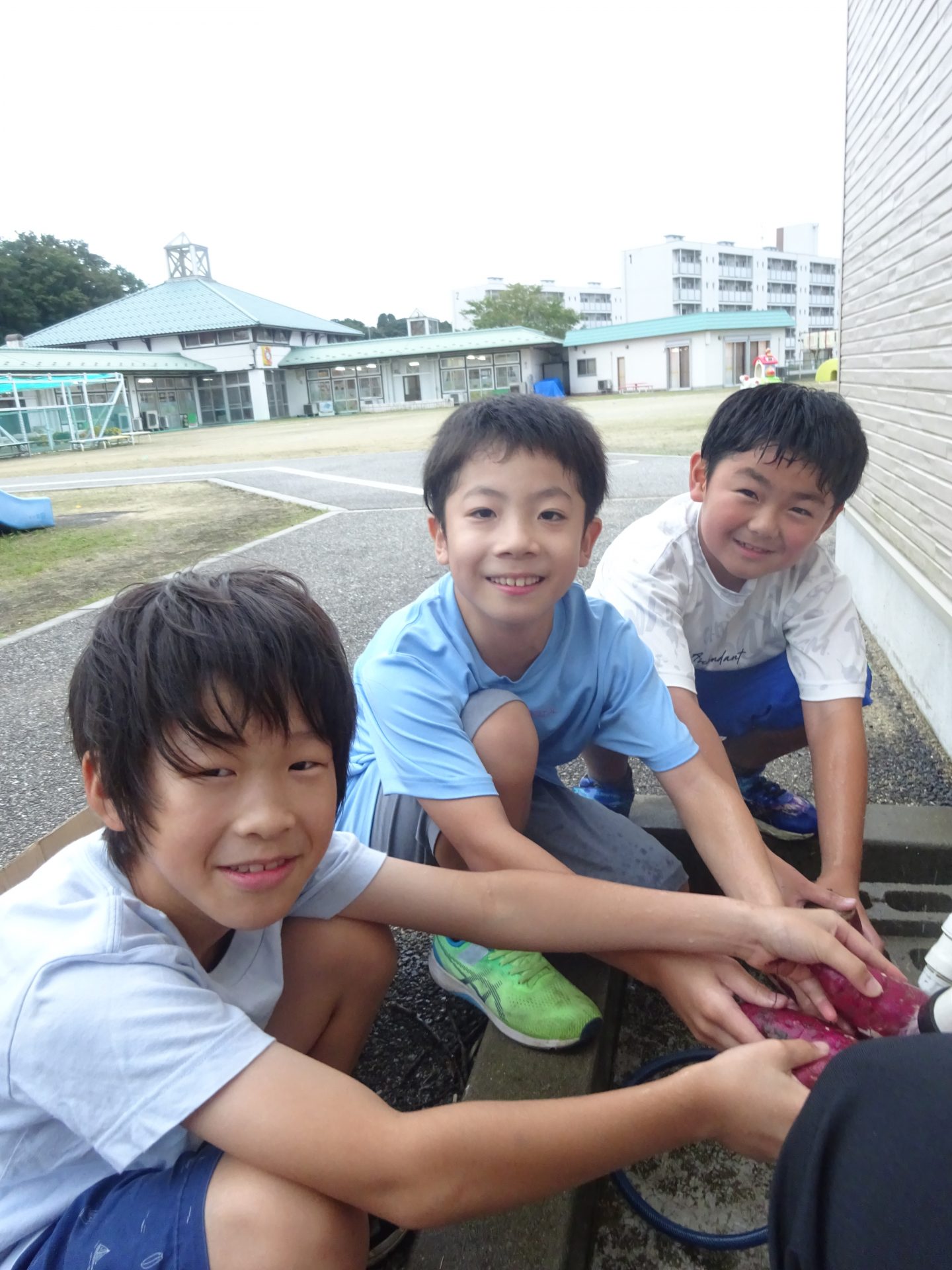 学校行事のため、いつもより早く帰ってきた児童4名に手伝ってもらいながら準備をしました。前日には下準備として、3年生にさつまいもを洗ってもらいました。