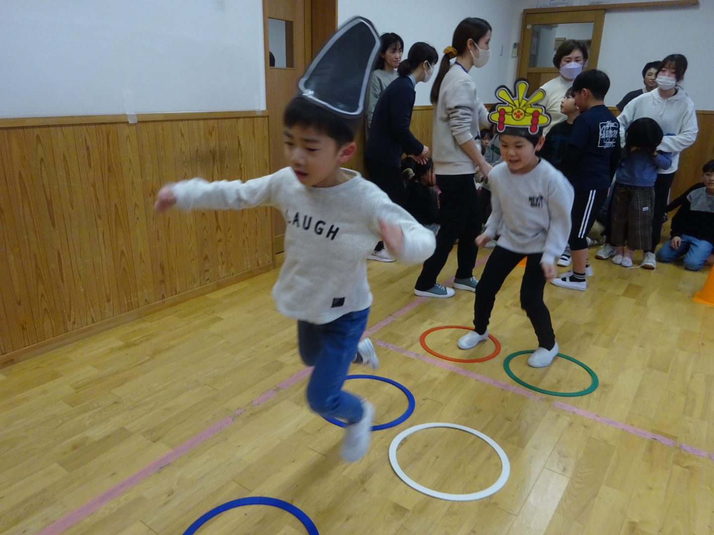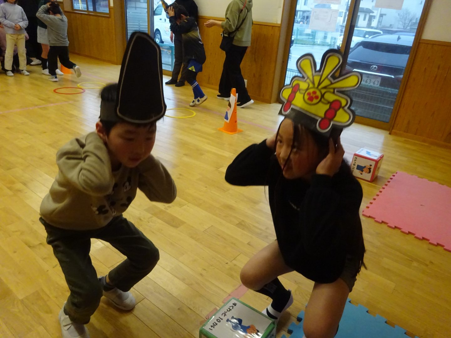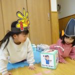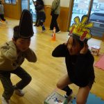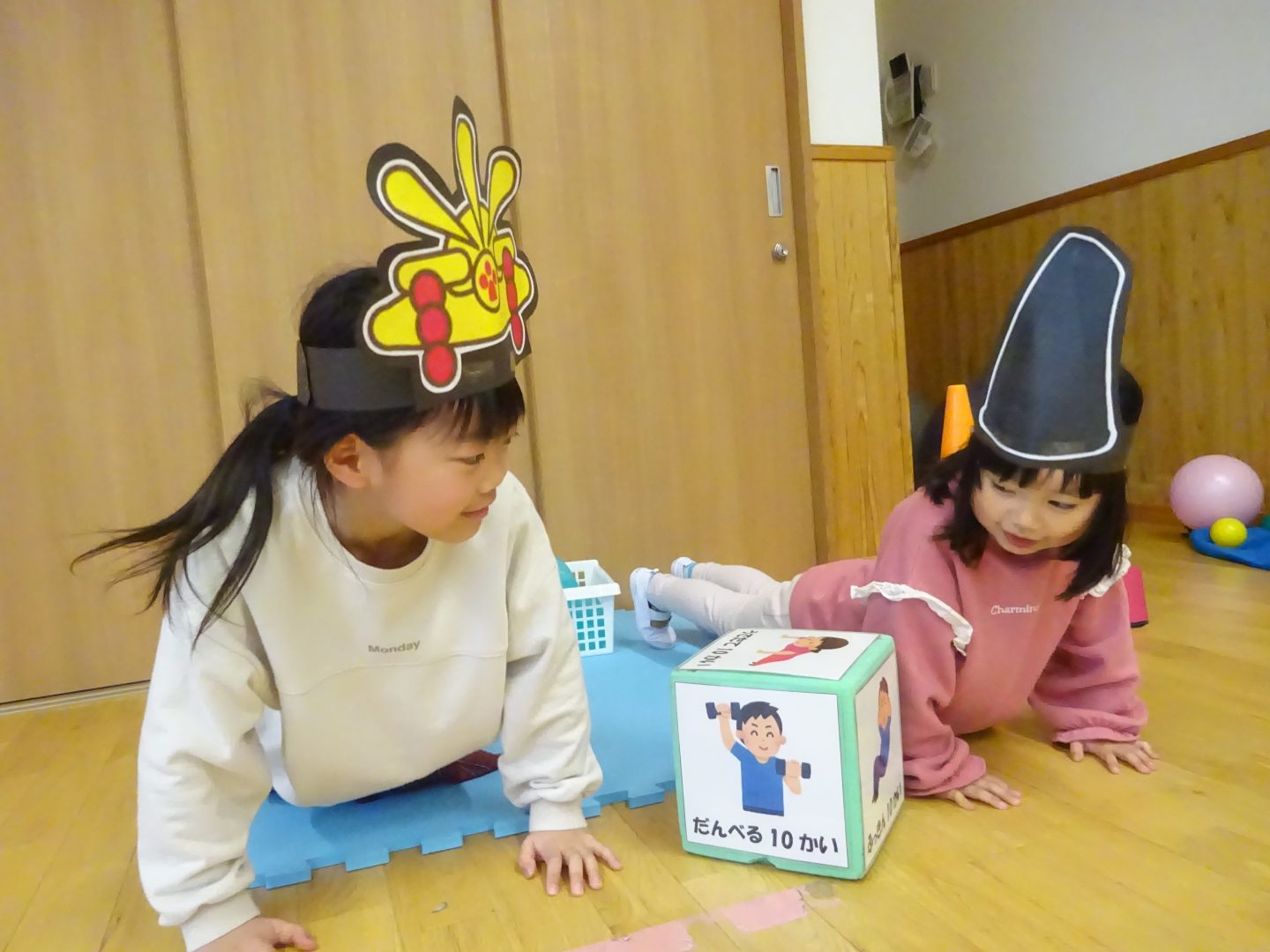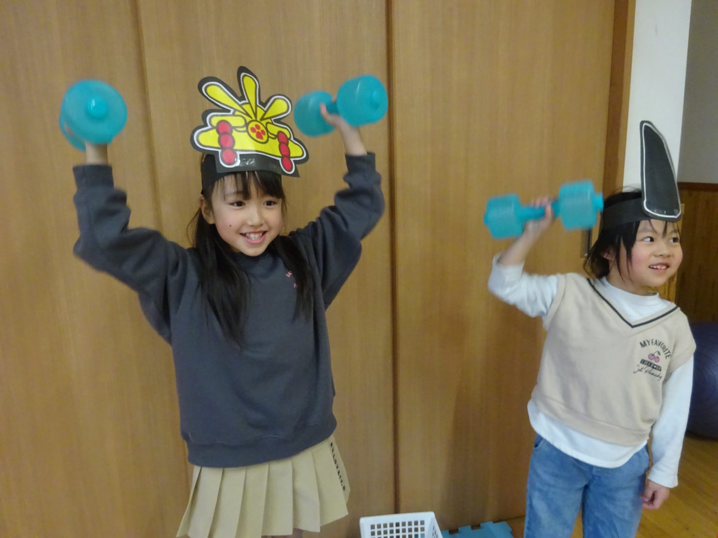 3月3日(火)ひかりのお友達と一緒にひなまつり会を開催しました。『ひなあられボール送りゲーム』や、お内裏様やお雛様に変装して『ひなまつり筋トレリレー』を、楽しみました。スクワットやダンベルを持ち上げ、『お腹プルプルしてきた!』、『あと、5回!』等と、楽しい会話が聞こえてきました。仲間の応援にも力が入っていました。