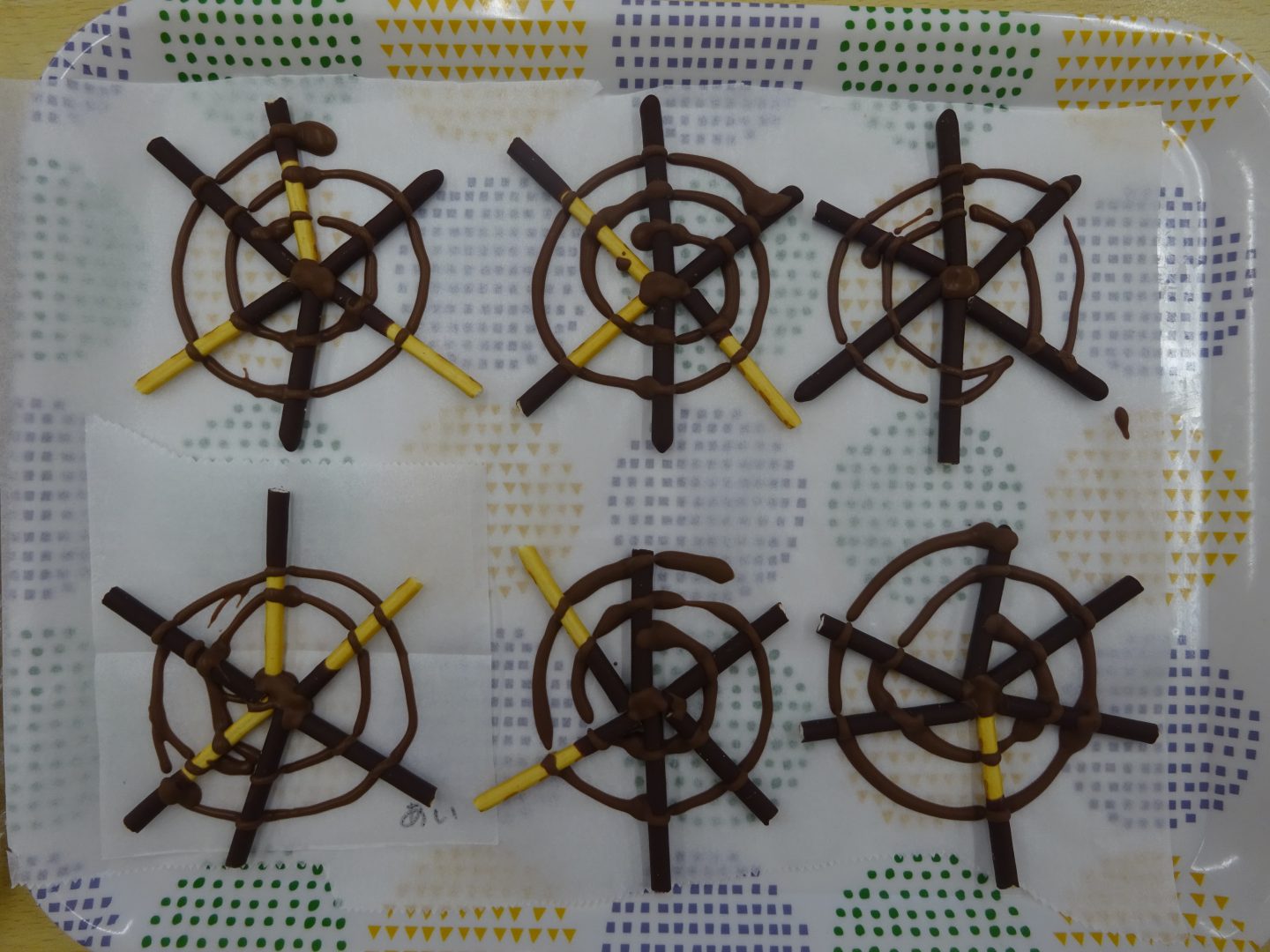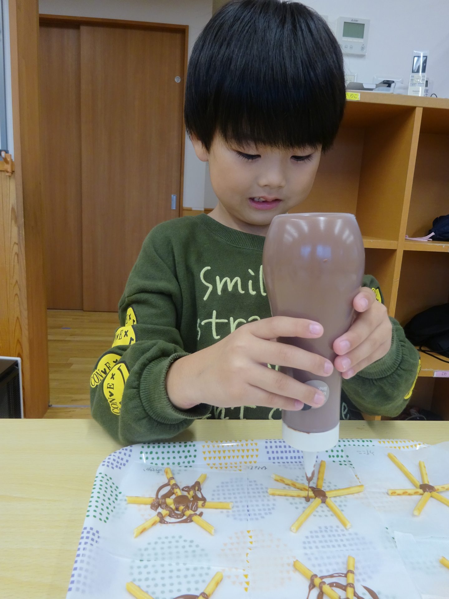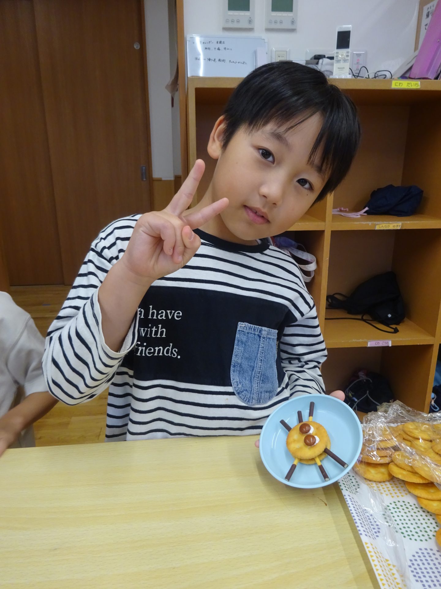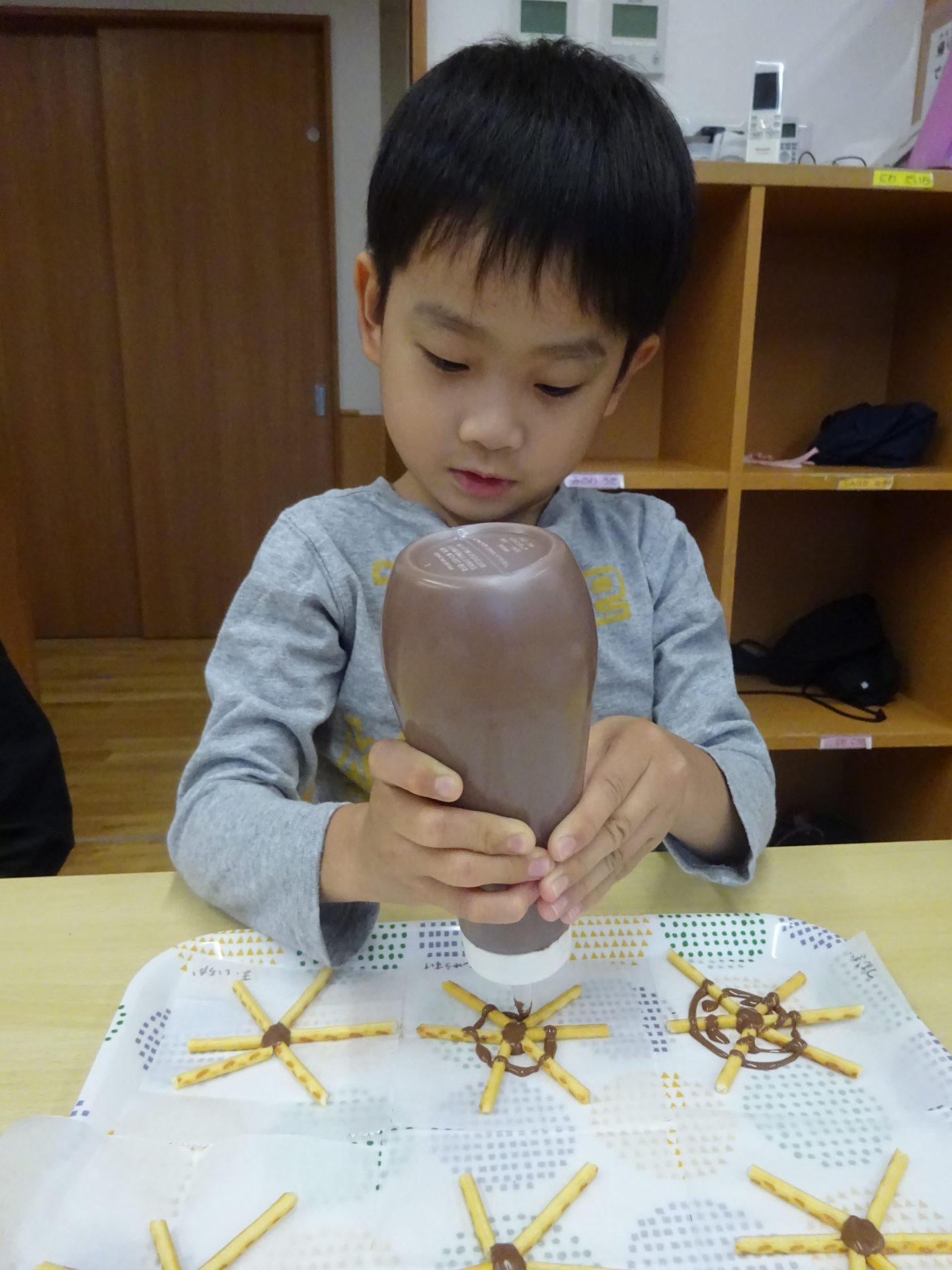 10月20日(月)みんなが楽しみにしていた、”HALLOWEEN”のクッキングをしました。今年は、2種類のデコレーションに挑戦!一つは、クラッカーにポッキーをはさみ、スパイダー風に。もう一つは、ポッキーにチョコレートをかけて、冷蔵庫で冷やし、蜘蛛の巣風に。それぞれの個性で、色々な雰囲気のスパイダーや蜘蛛の巣ができ、みんなは大満足!「かわいすぎて、食べるのもったいないな~」「家でも、作ってみたいな!」と、盛り上がっていました。