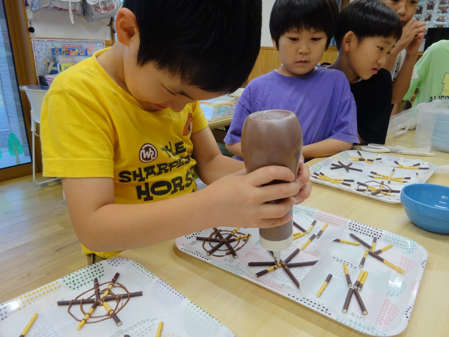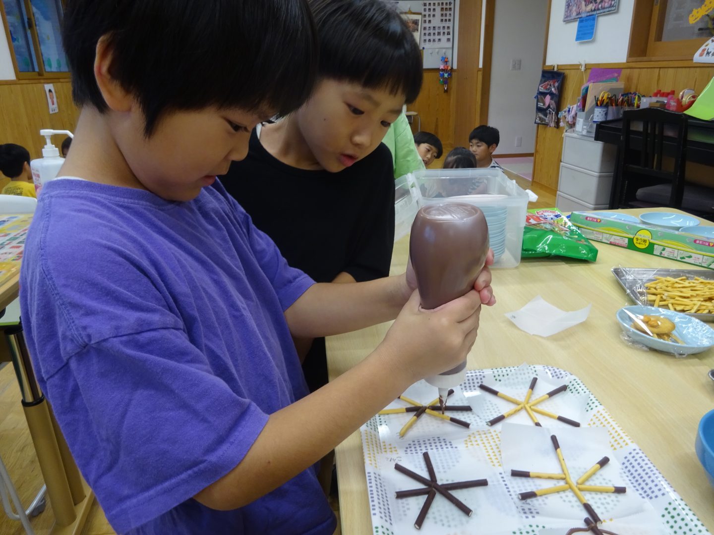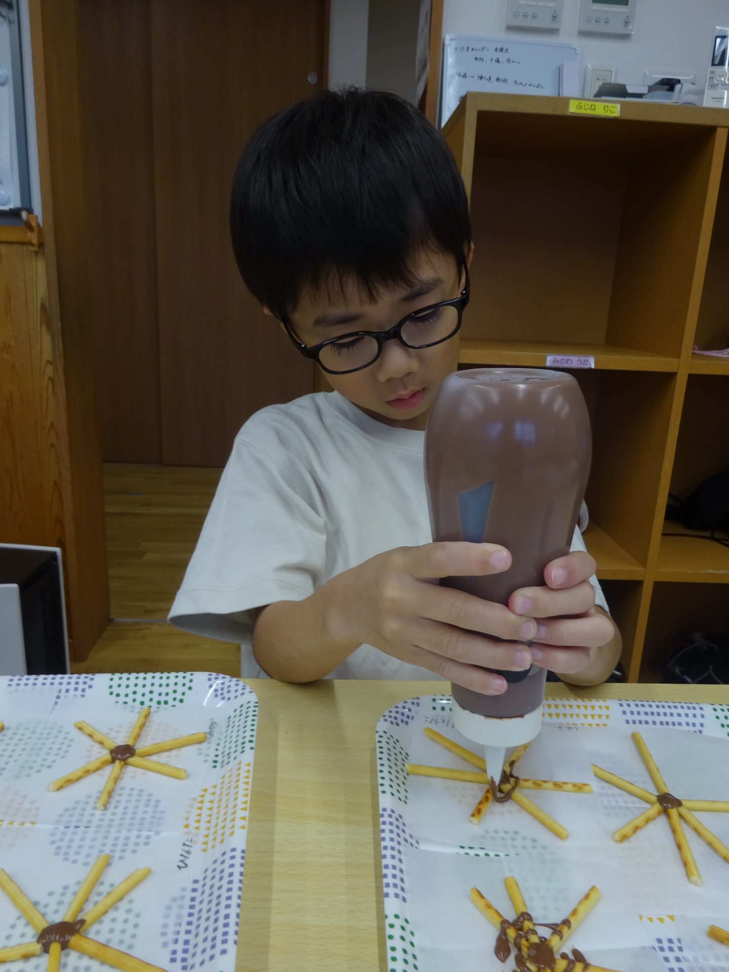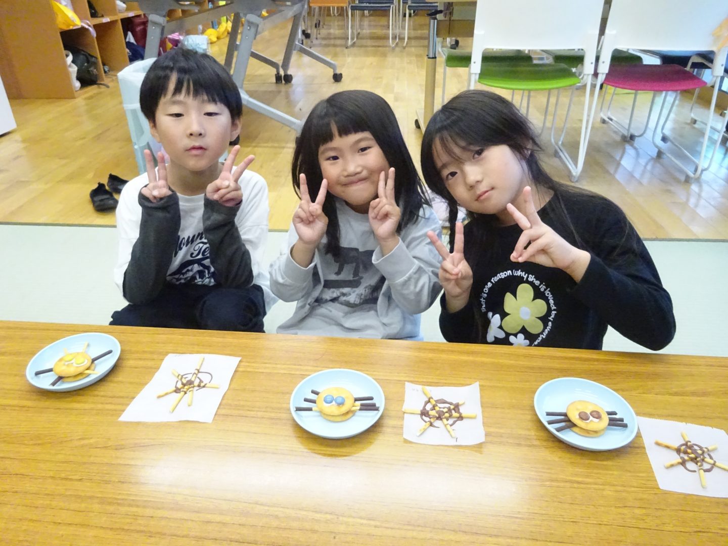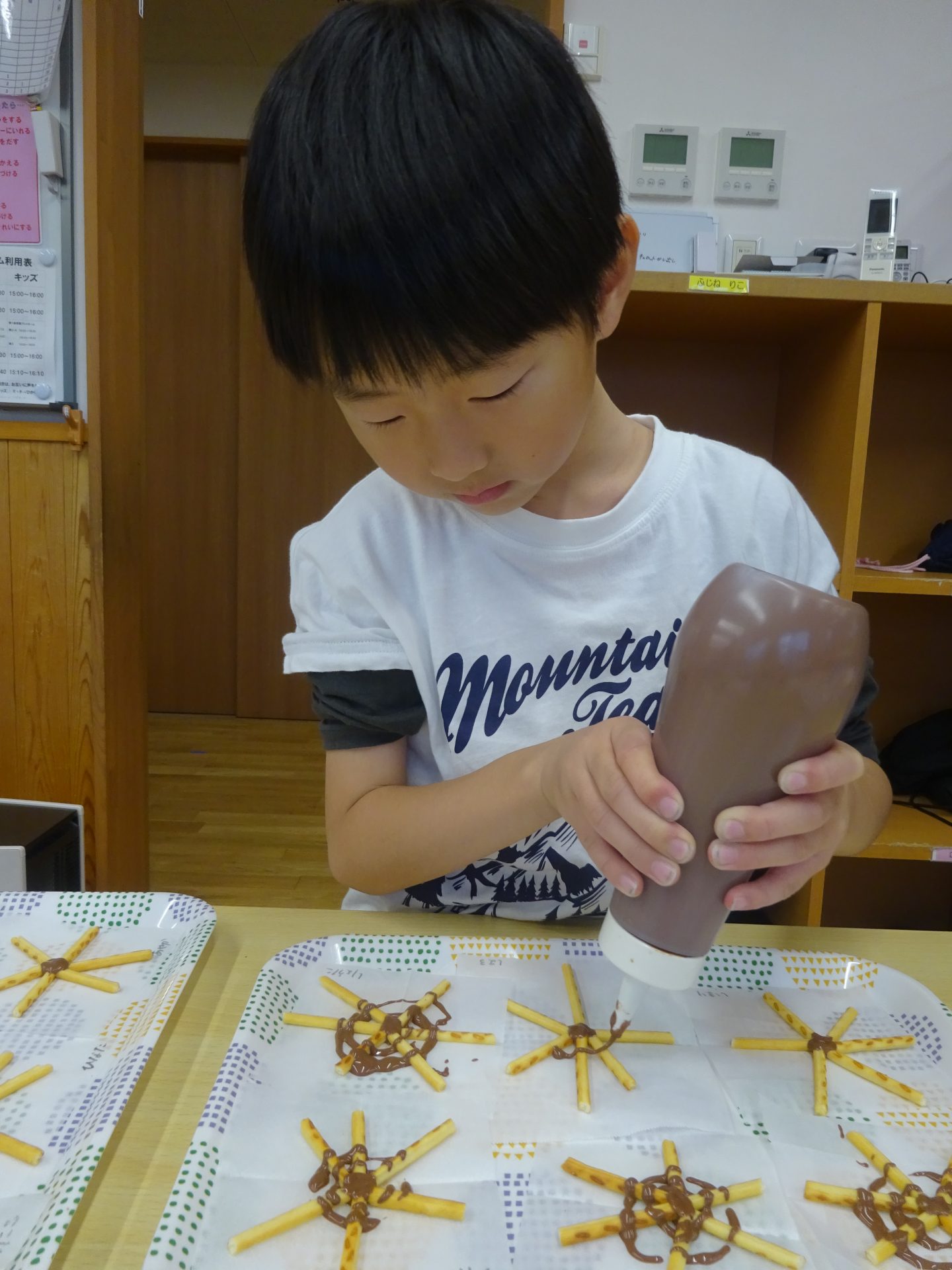 10月20日(月)みんなが楽しみにしていた、”HALLOWEEN”のクッキングをしました。今年は、2種類のデコレーションに挑戦!一つは、クラッカーにポッキーをはさみ、スパイダー風に。もう一つは、ポッキーにチョコレートをかけて、冷蔵庫で冷やし、蜘蛛の巣風に。それぞれの個性で、色々な雰囲気のスパイダーや蜘蛛の巣ができ、みんなは大満足!「かわいすぎて、食べるのもったいないな~」「家でも、作ってみたいな!」と、盛り上がっていました。