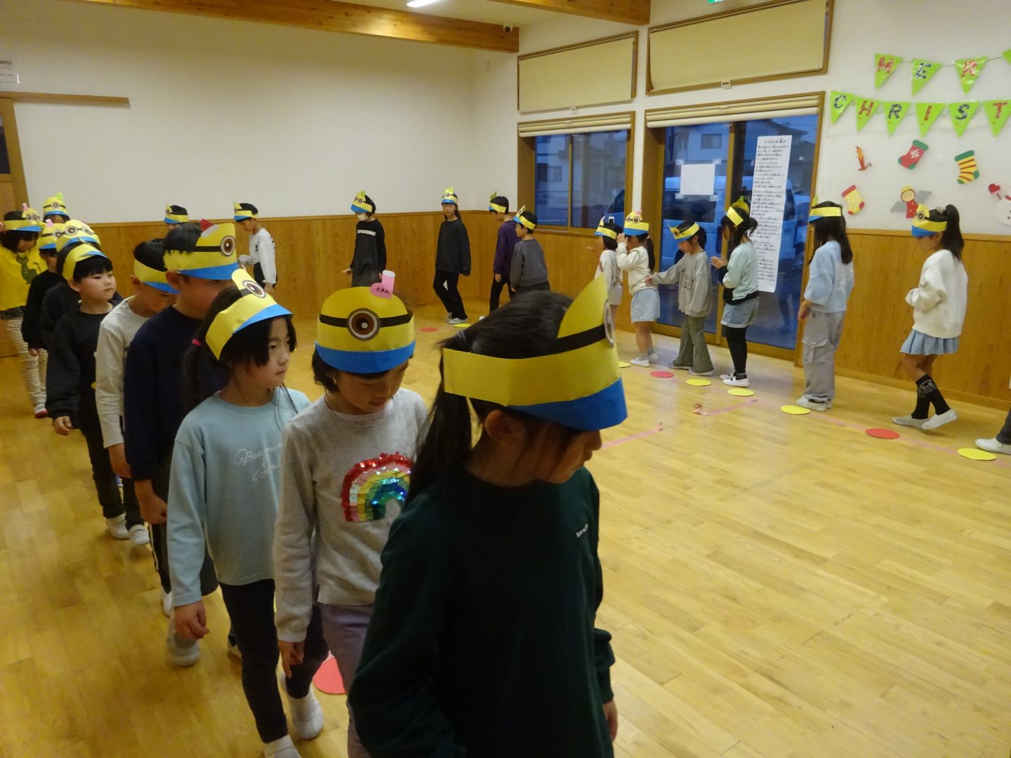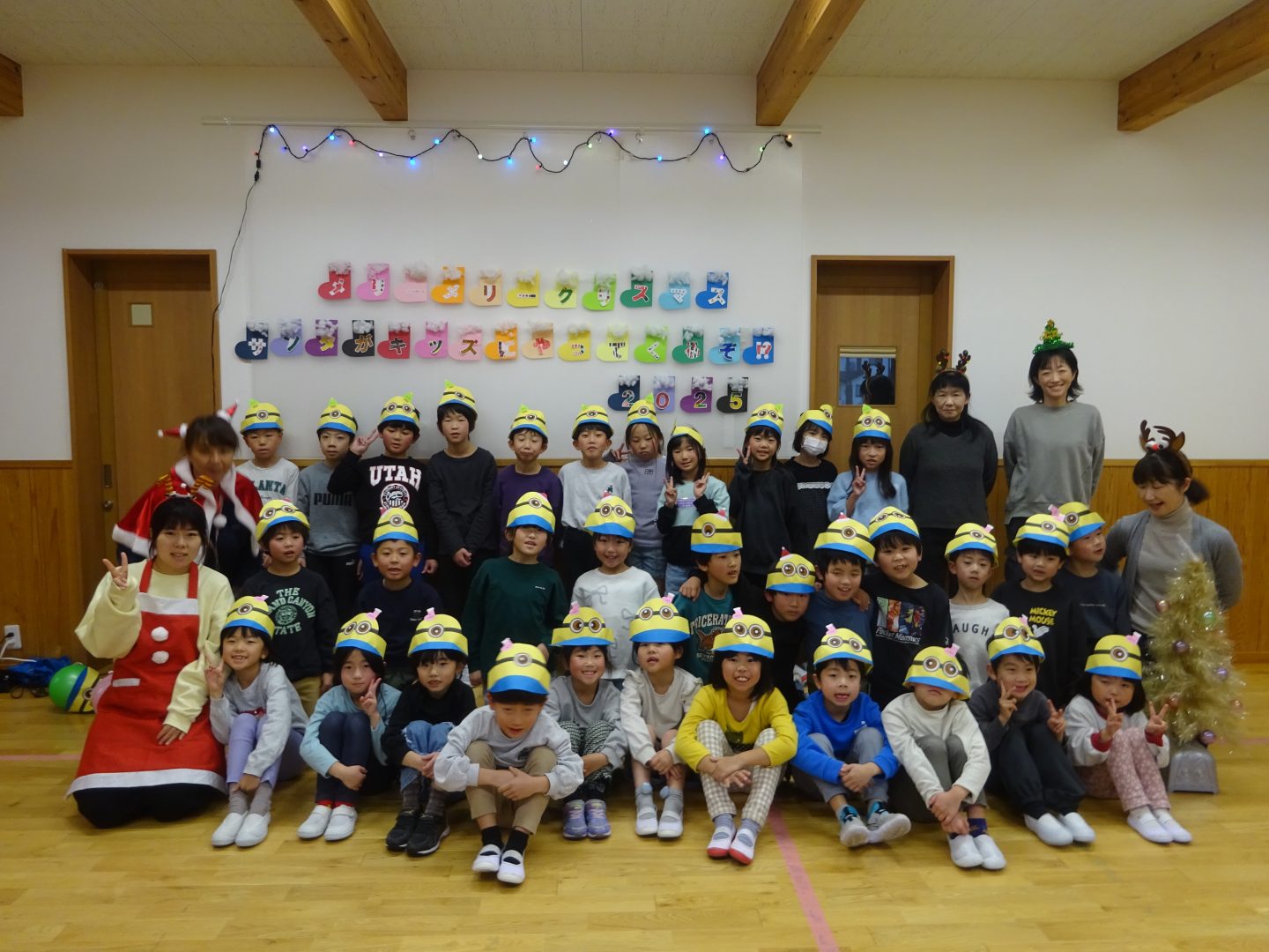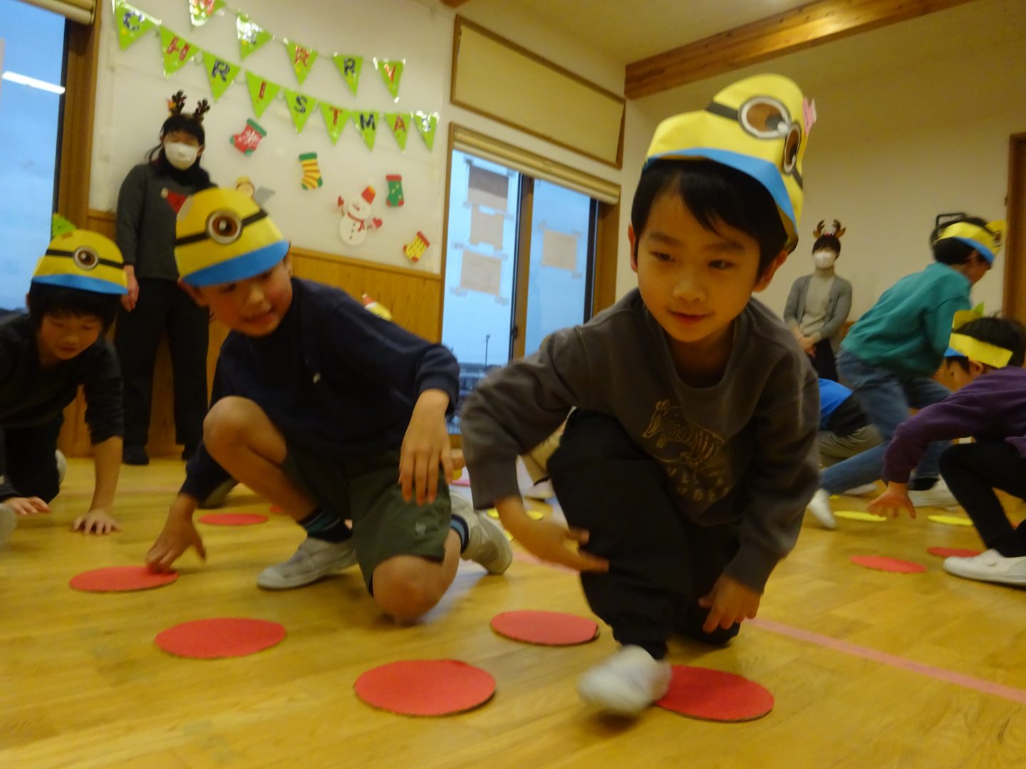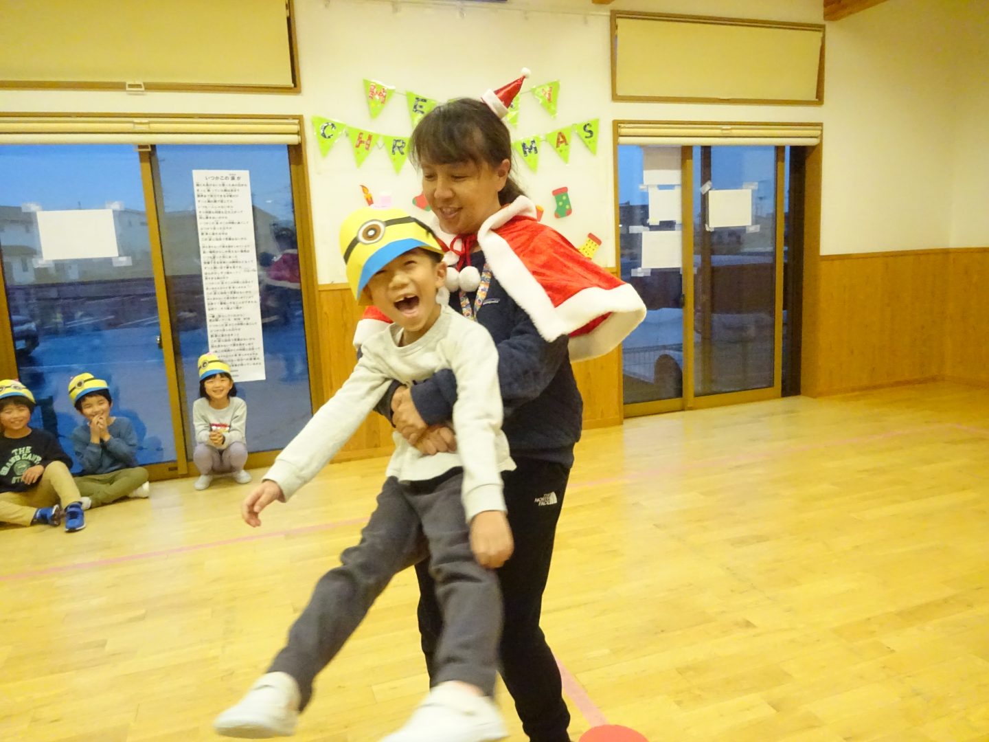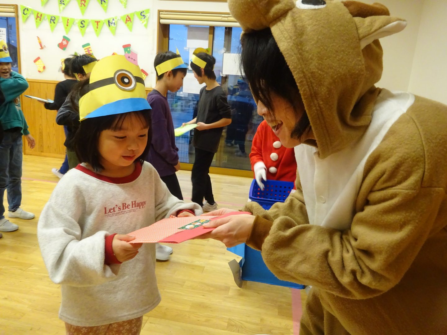 ミニオン風の帽子をかぶり、クリスマスのにぎやかな雰囲気も伝わってきます!『サンタの帽子リレー』や『いす取りゲーム』をして盛り上がっていると、サンタとトナカイが登場!「え?本物のサンタさん?」「なんか○○先生にそっくり!」と言いながら、プレゼントをもらいとっても嬉しそうでした!