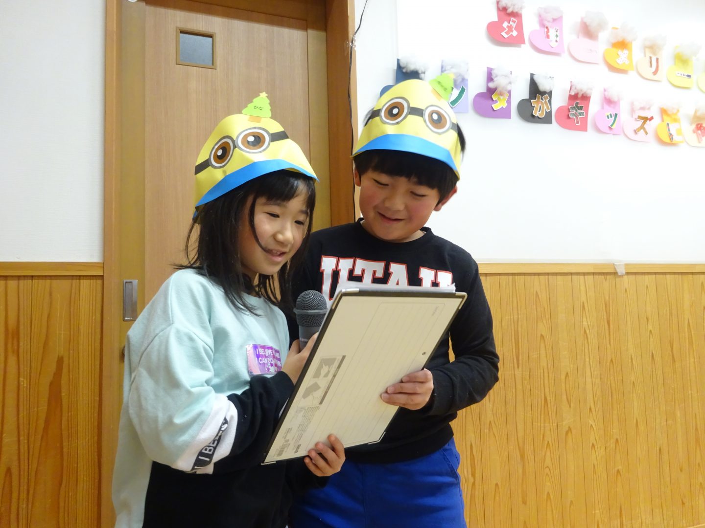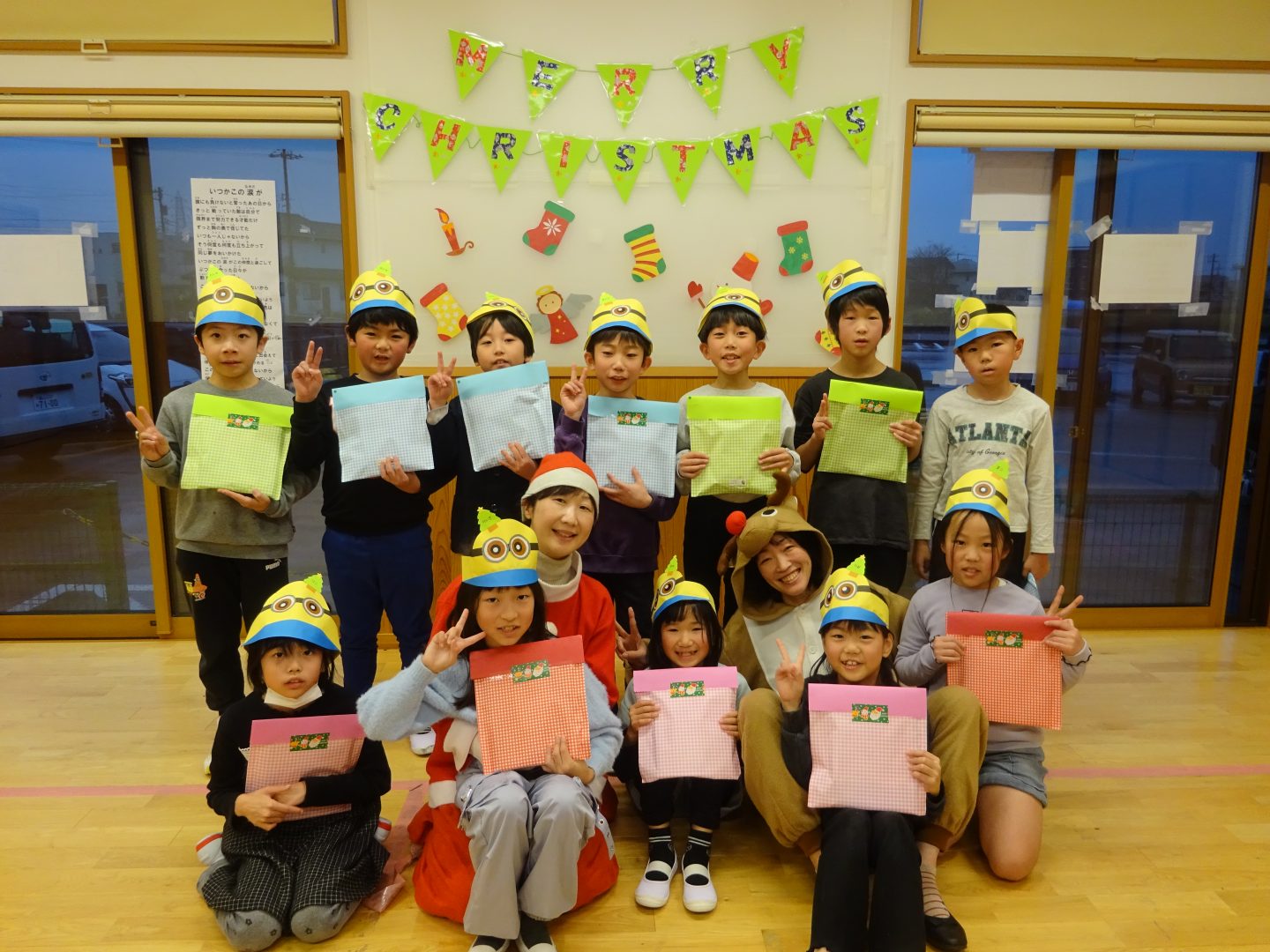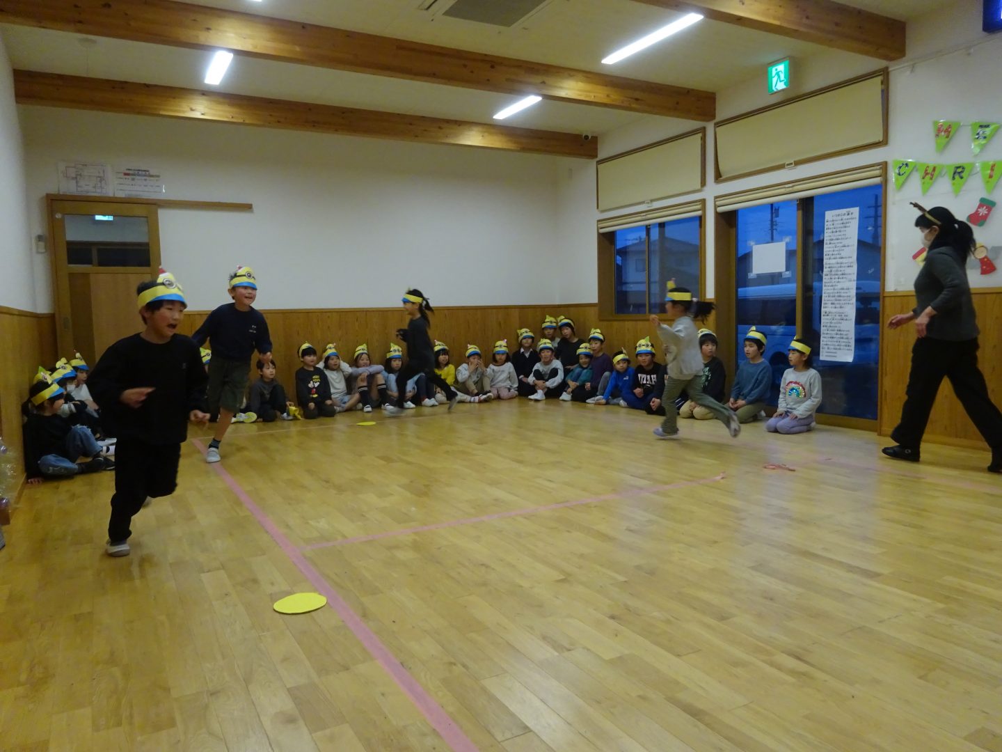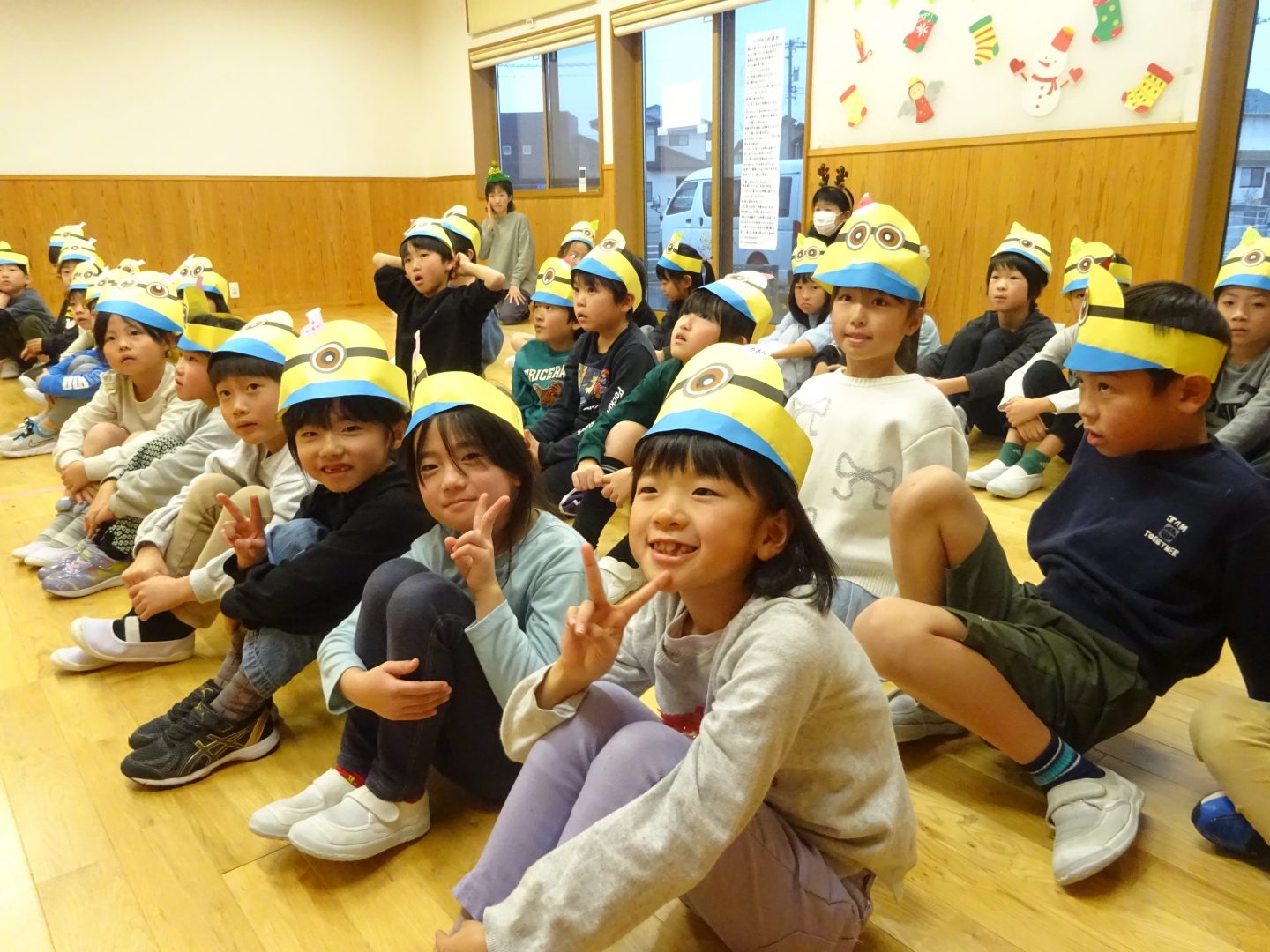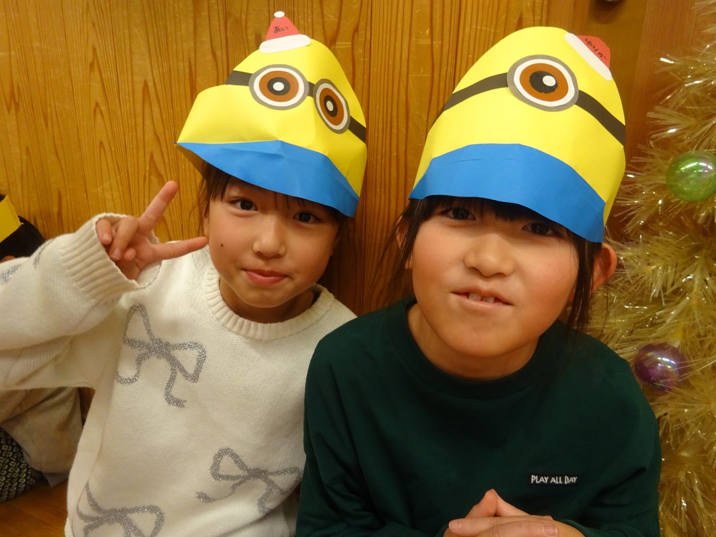 ミニオン風の帽子をかぶり、クリスマスのにぎやかな雰囲気も伝わってきます!『サンタの帽子リレー』や『いす取りゲーム』をして盛り上がっていると、サンタとトナカイが登場!「え?本物のサンタさん?」「なんか○○先生にそっくり!」と言いながら、プレゼントをもらいとっても嬉しそうでした!