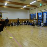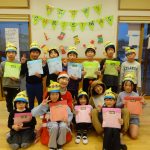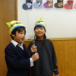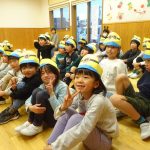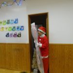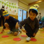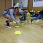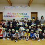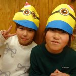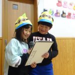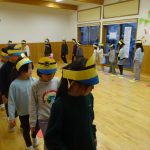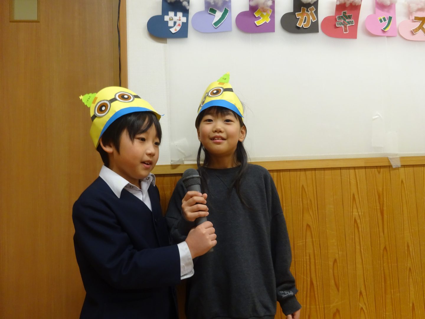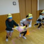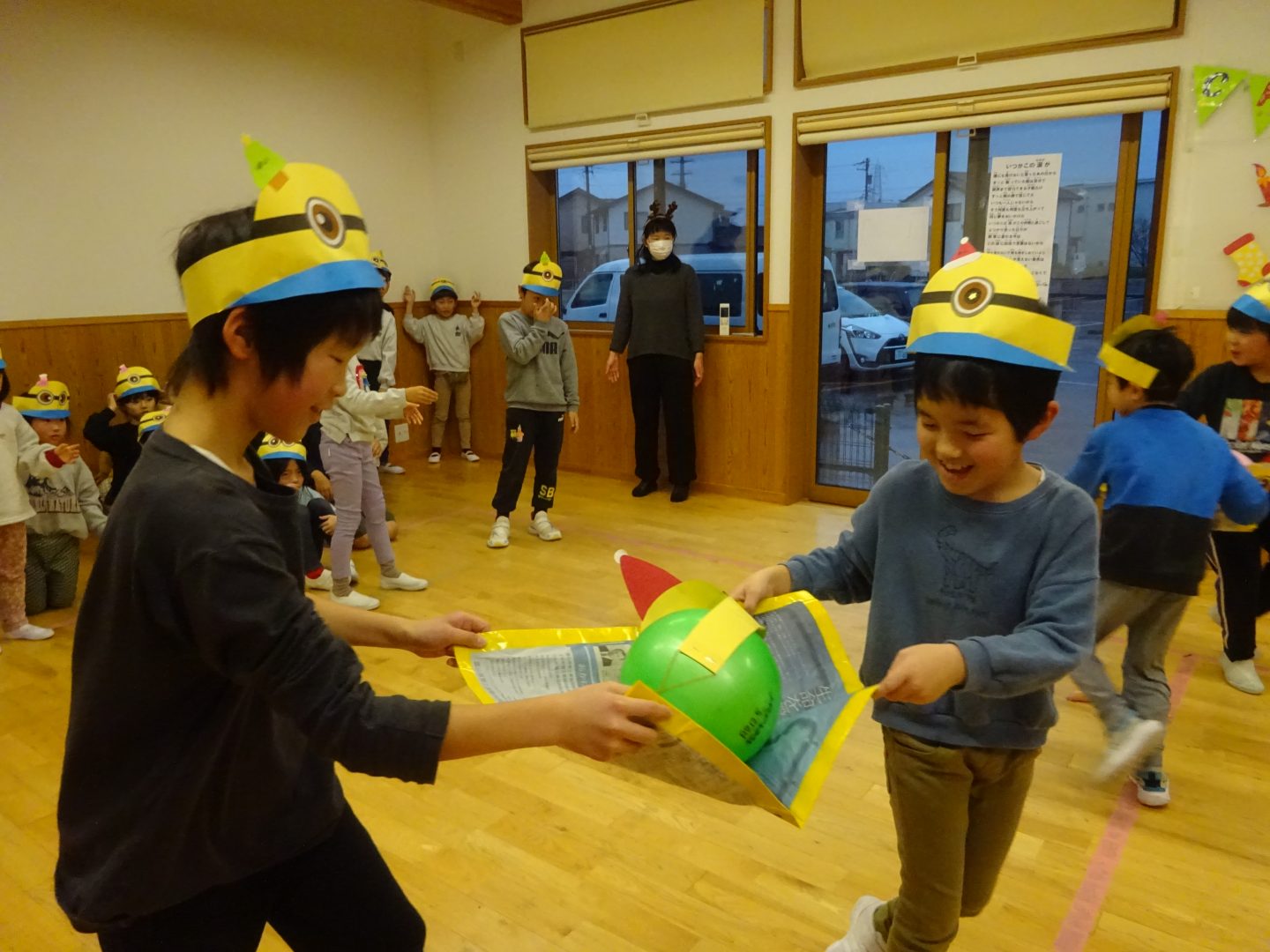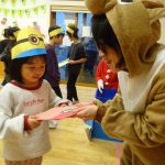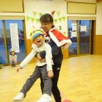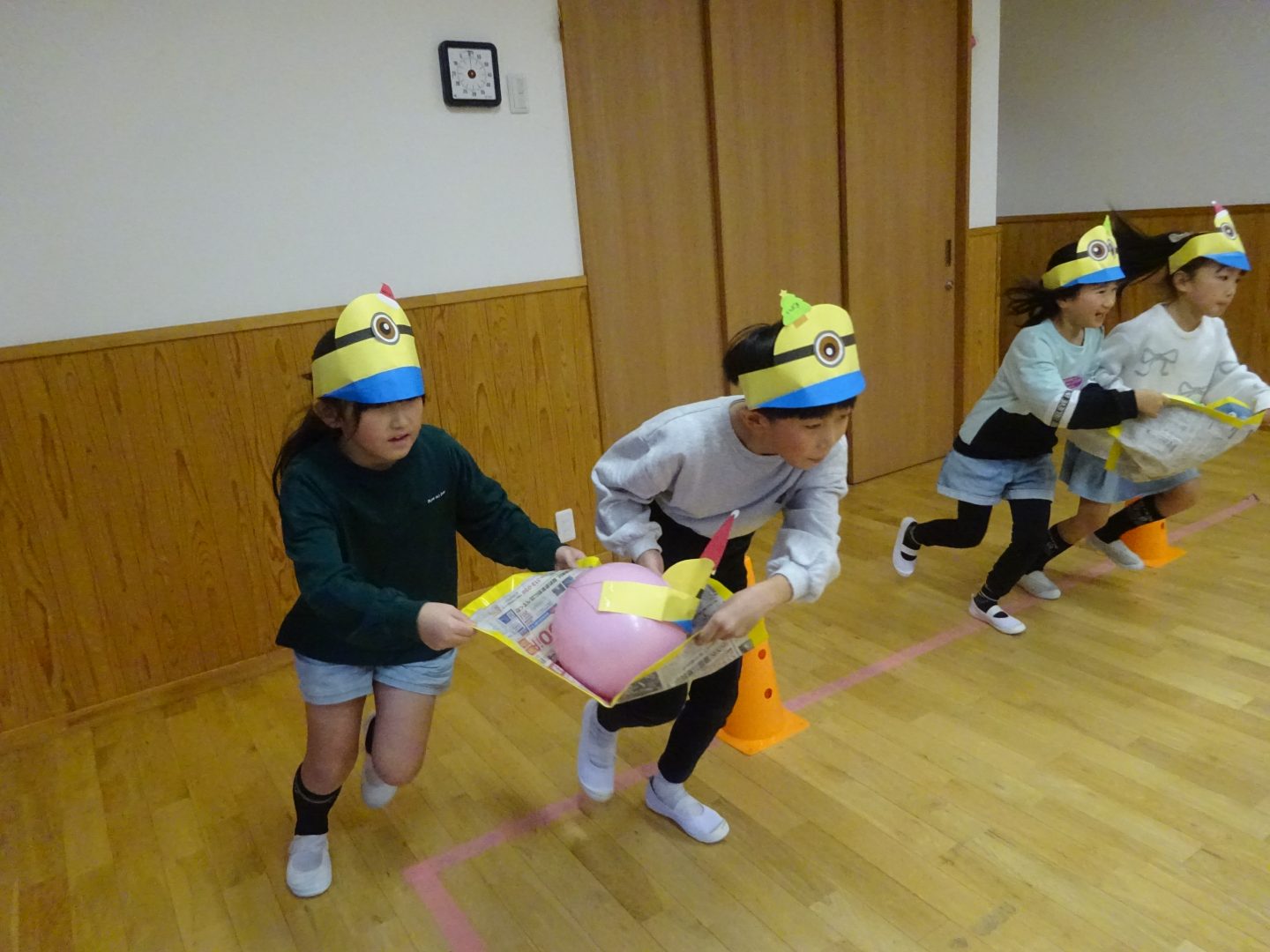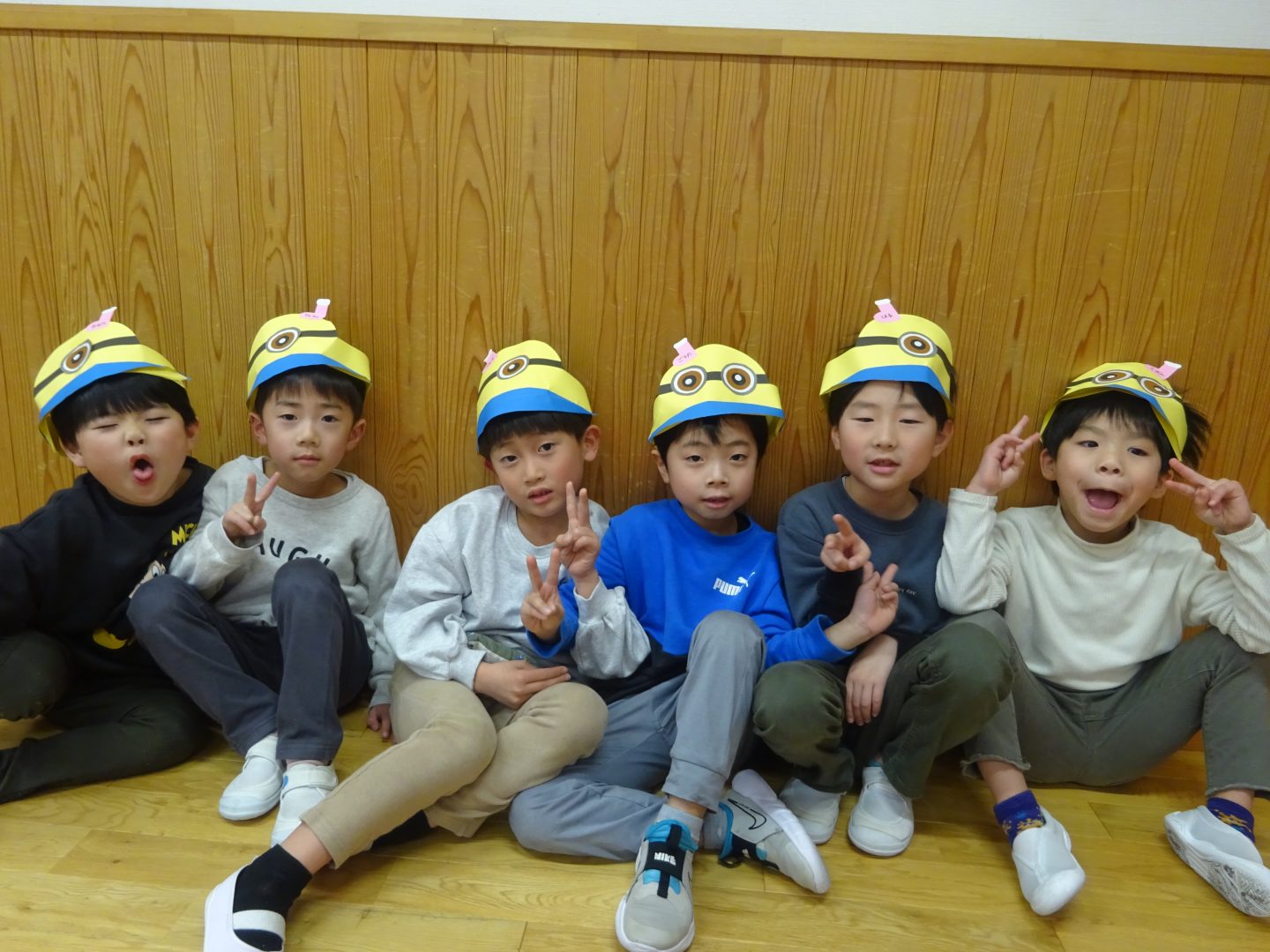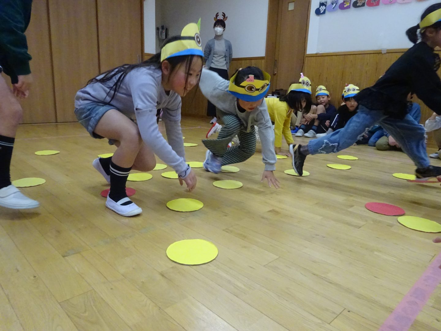 ミニオン風の帽子をかぶり、クリスマスのにぎやかな雰囲気も伝わってきます!『サンタの帽子リレー』や『いす取りゲーム』をして盛り上がっていると、サンタとトナカイが登場!「え?本物のサンタさん?」「なんか○○先生にそっくり!」と言いながら、プレゼントをもらいとっても嬉しそうでした!