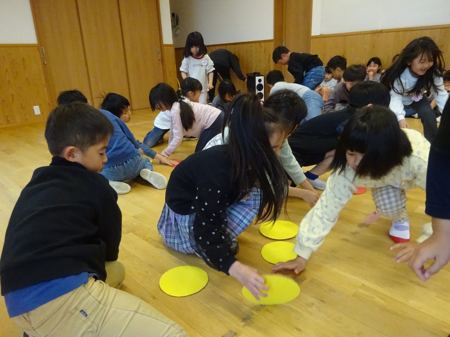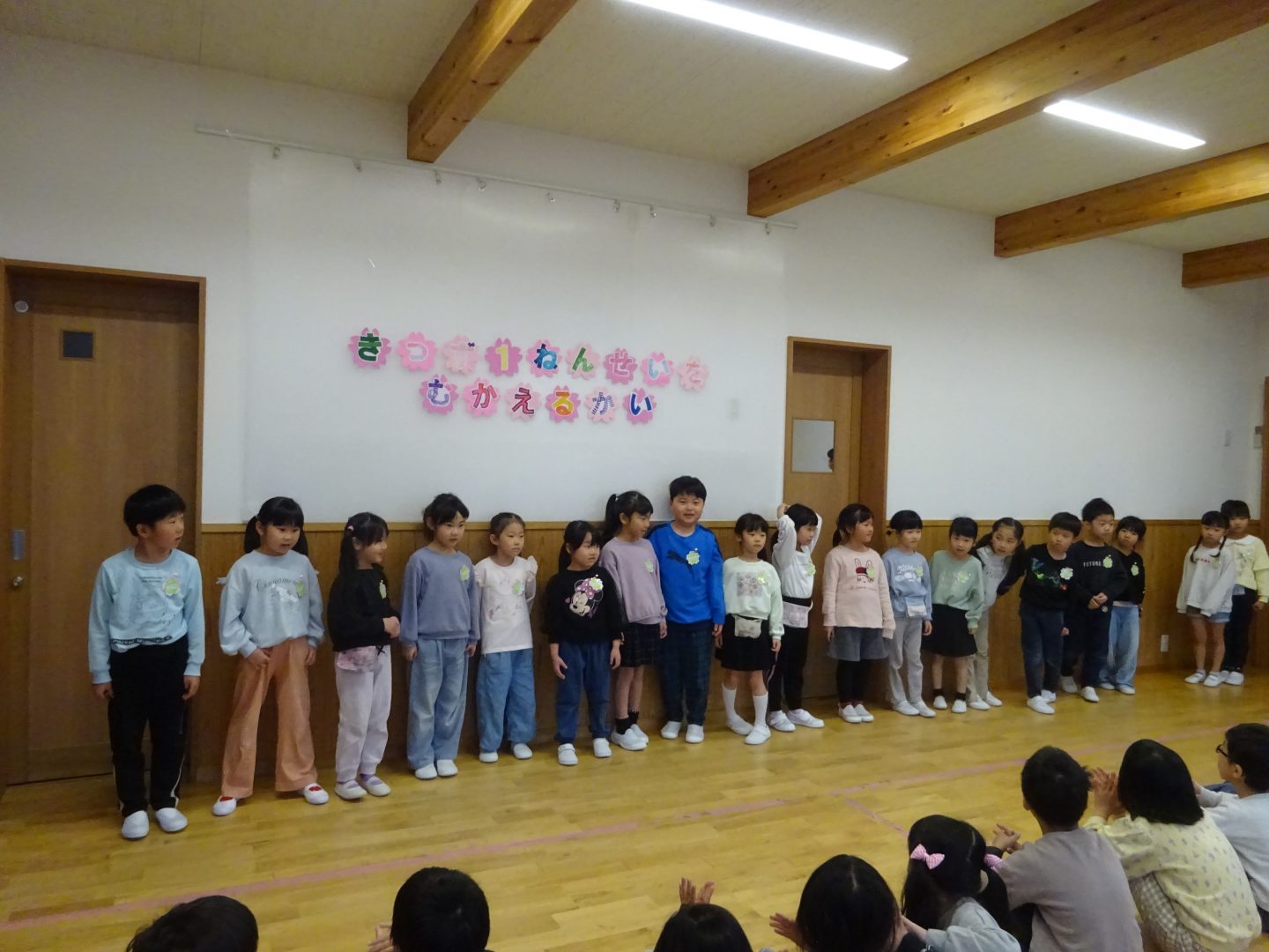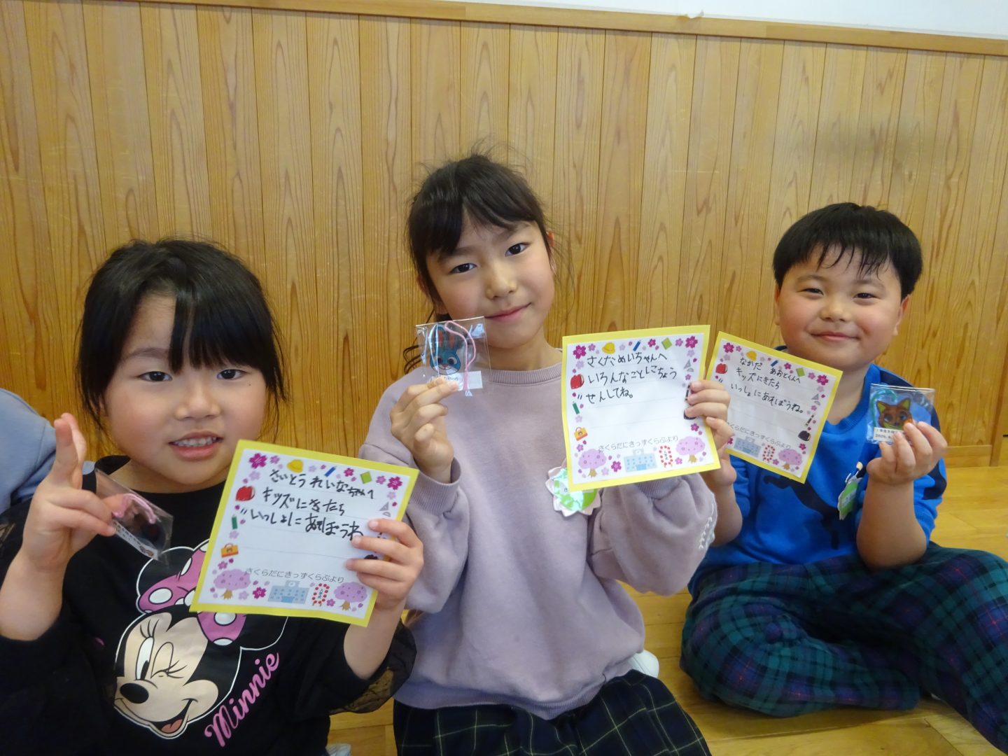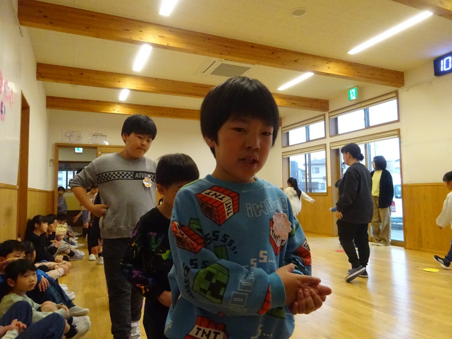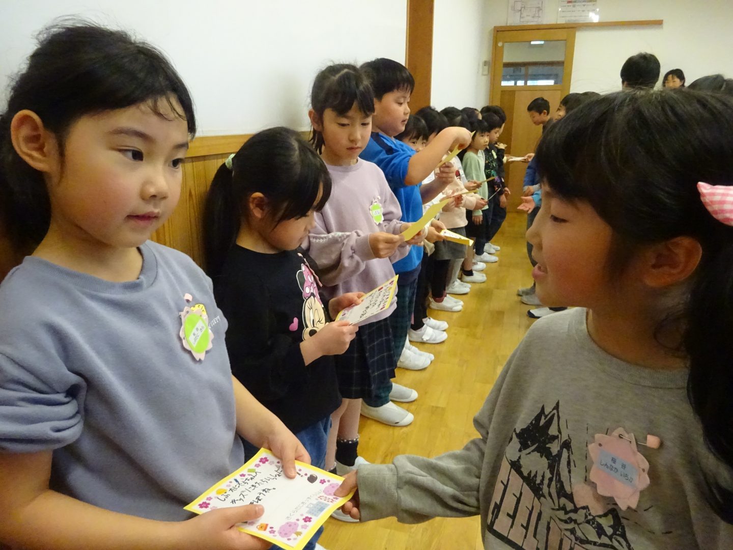 今日は『1年生を迎える会』を開催しました。3年生を中心に、企画・準備をしました。初司会にもドキドキしながら、大きな声で進行をつとめてくれました。1年生は、プレゼントや手紙をもらいとっても嬉しそうでした。また、一緒に『パタパタゲーム』『椅子取りゲーム』『フープくぐり』なども楽しみました。「こっち、あいてるよ!」「負けて、くやしかったね!」と、寄り添ってくれる上級生の優しい姿もみられました。