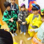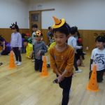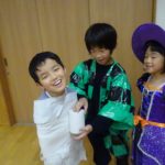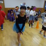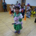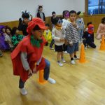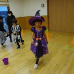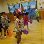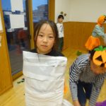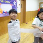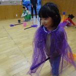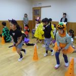 キッズクラブの恒例になっている【ミイラ巻きゲーム】や【魔女のほうきリレー】をして楽しみました。リレーは、