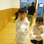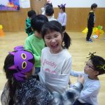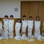 ほうきを足で挟みながら走るのに苦戦する姿や、目玉を運ぶところでは、ドキドキしながらも落とさないように慎重に運んでる児童もいました。ミイラ巻きでは、3年生がコツを掴んで、1.2年生にアドバイスをしていました。「上から巻いたほうがいいよ!」「私らのグループは声出して、順番でいこう!」など、それぞれのチームで盛り上がっていました。