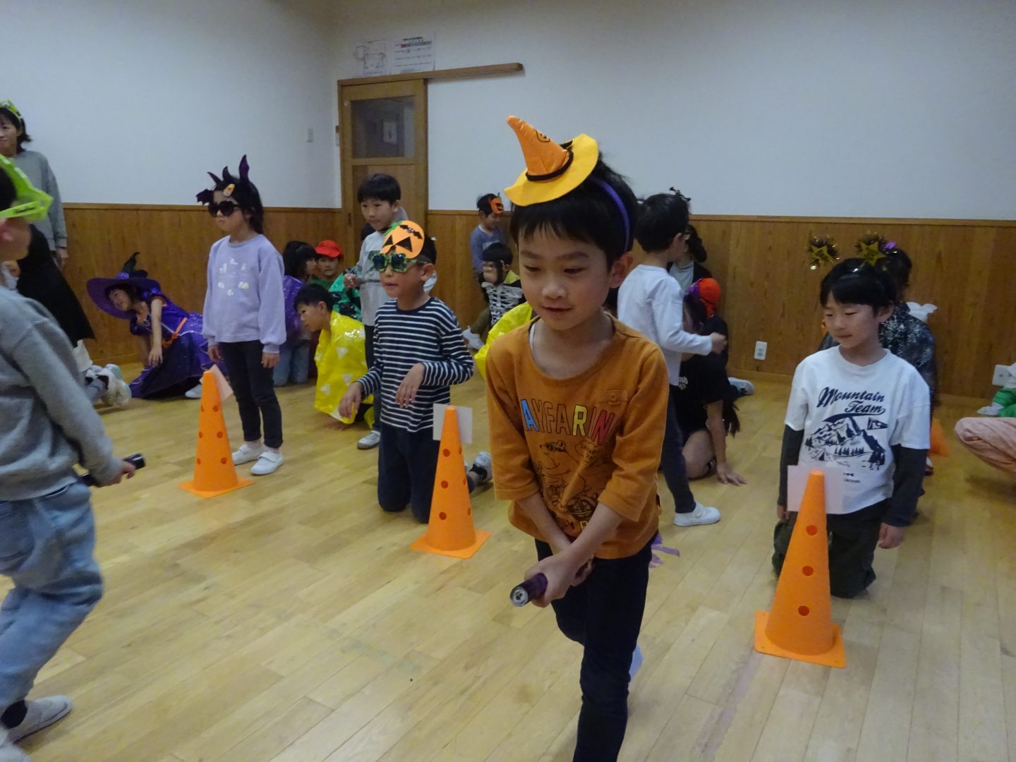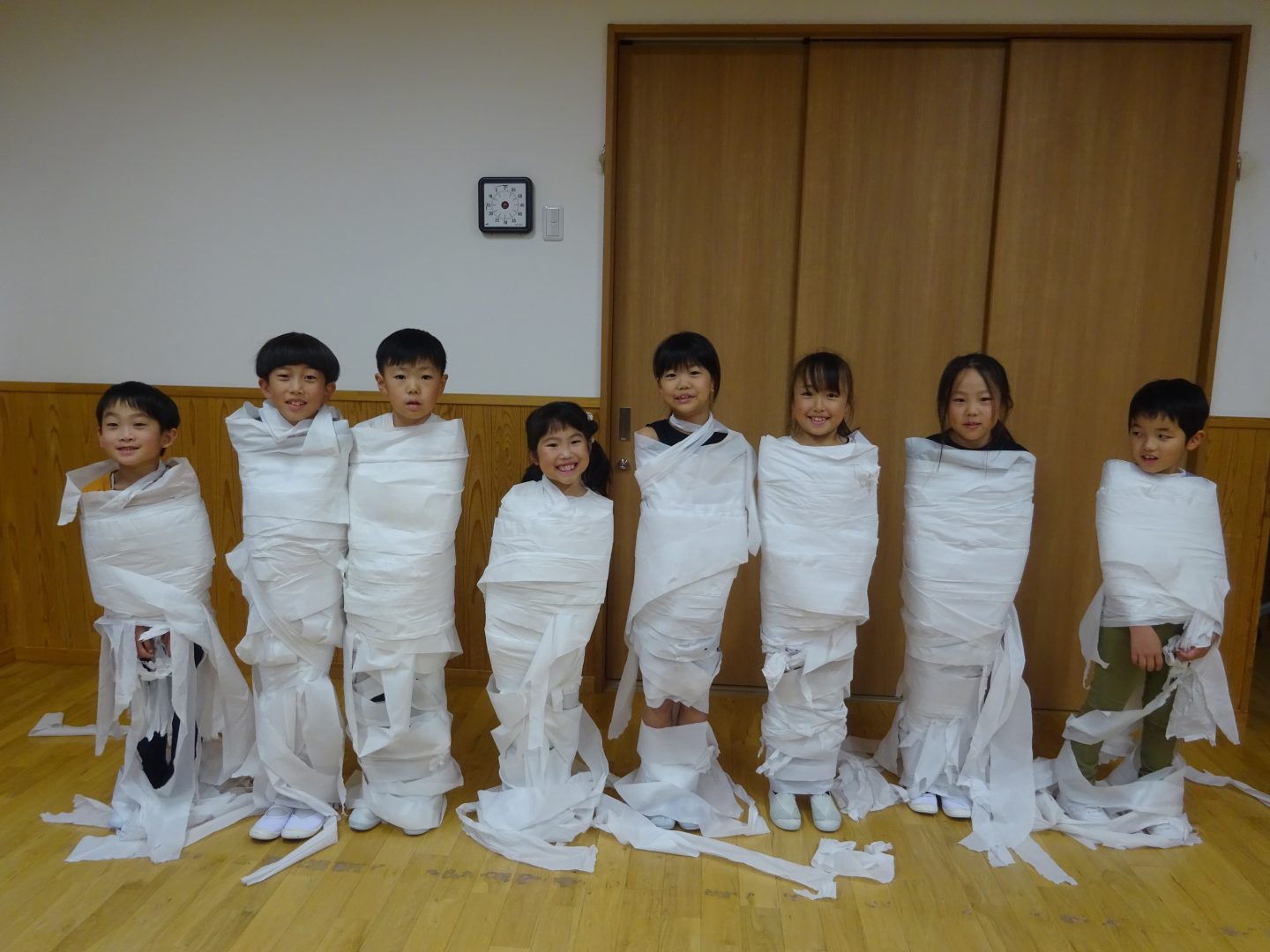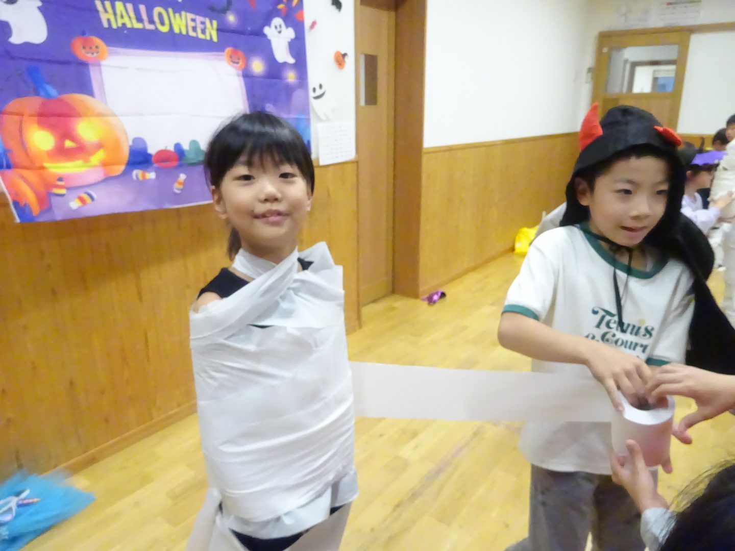 ほうきを足で挟みながら走るのに苦戦する姿や、目玉を運ぶところでは、ドキドキしながらも落とさないように慎重に運んでる児童もいました。ミイラ巻きでは、3年生がコツを掴んで、1.2年生にアドバイスをしていました。「上から巻いたほうがいいよ!」「私らのグループは声出して、順番でいこう!」など、それぞれのチームで盛り上がっていました。