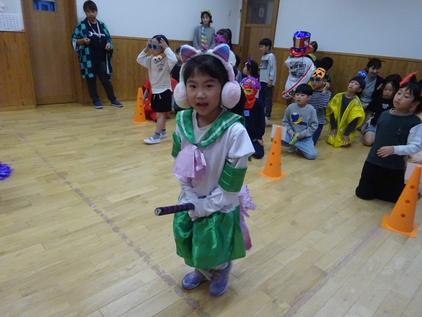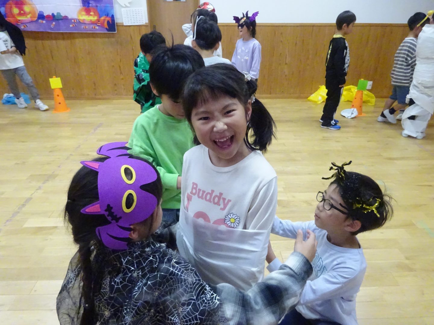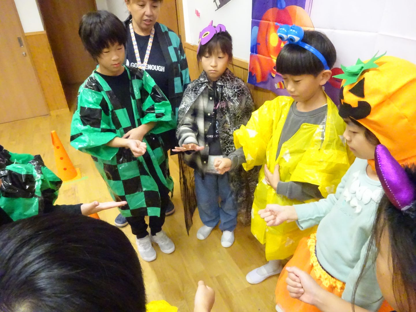 ほうきを足で挟みながら走るのに苦戦する姿や、目玉を運ぶところでは、ドキドキしながらも落とさないように慎重に運んでる児童もいました。ミイラ巻きでは、3年生がコツを掴んで、1.2年生にアドバイスをしていました。「上から巻いたほうがいいよ!」「私らのグループは声出して、順番でいこう!」など、それぞれのチームで盛り上がっていました。