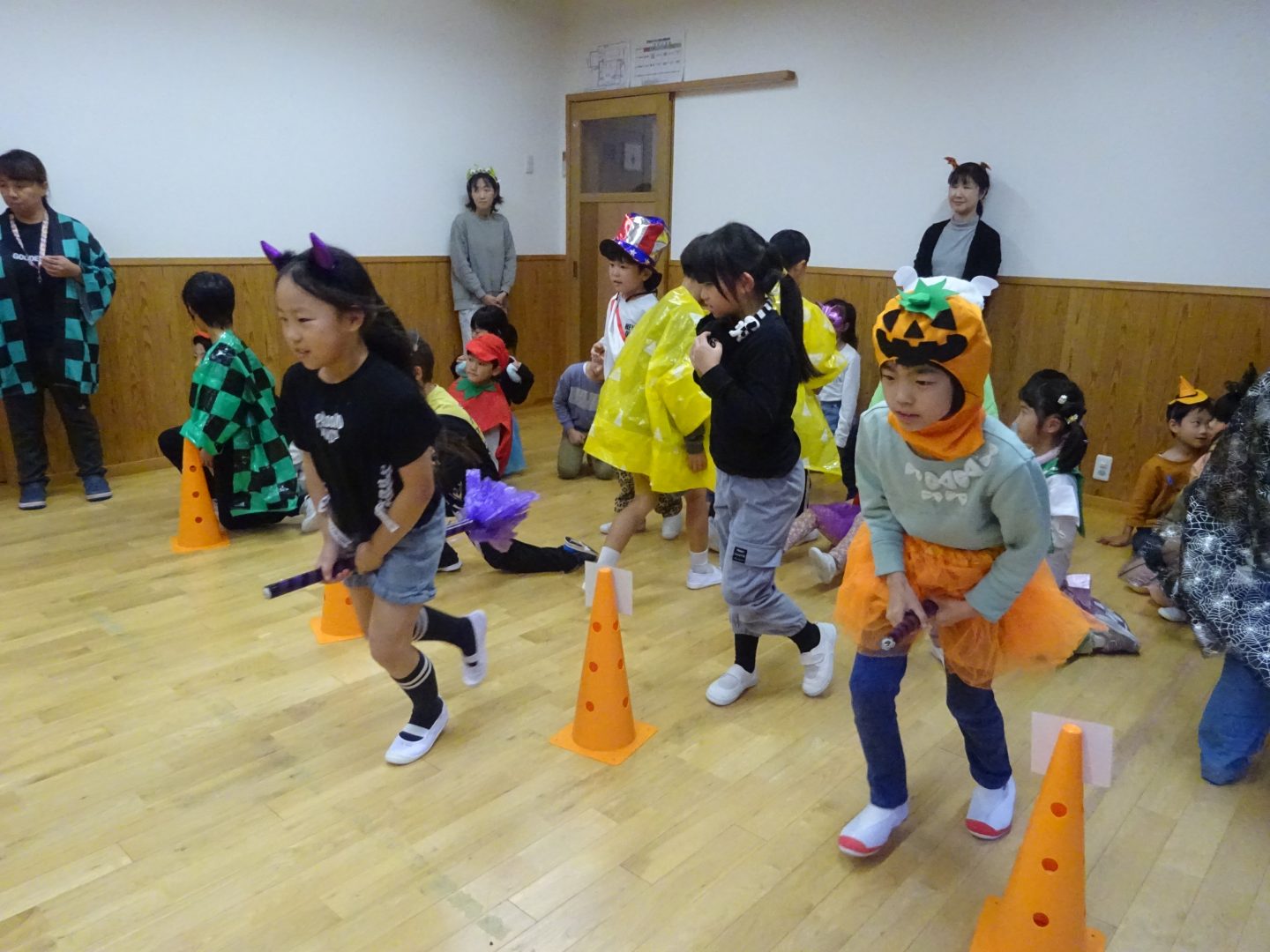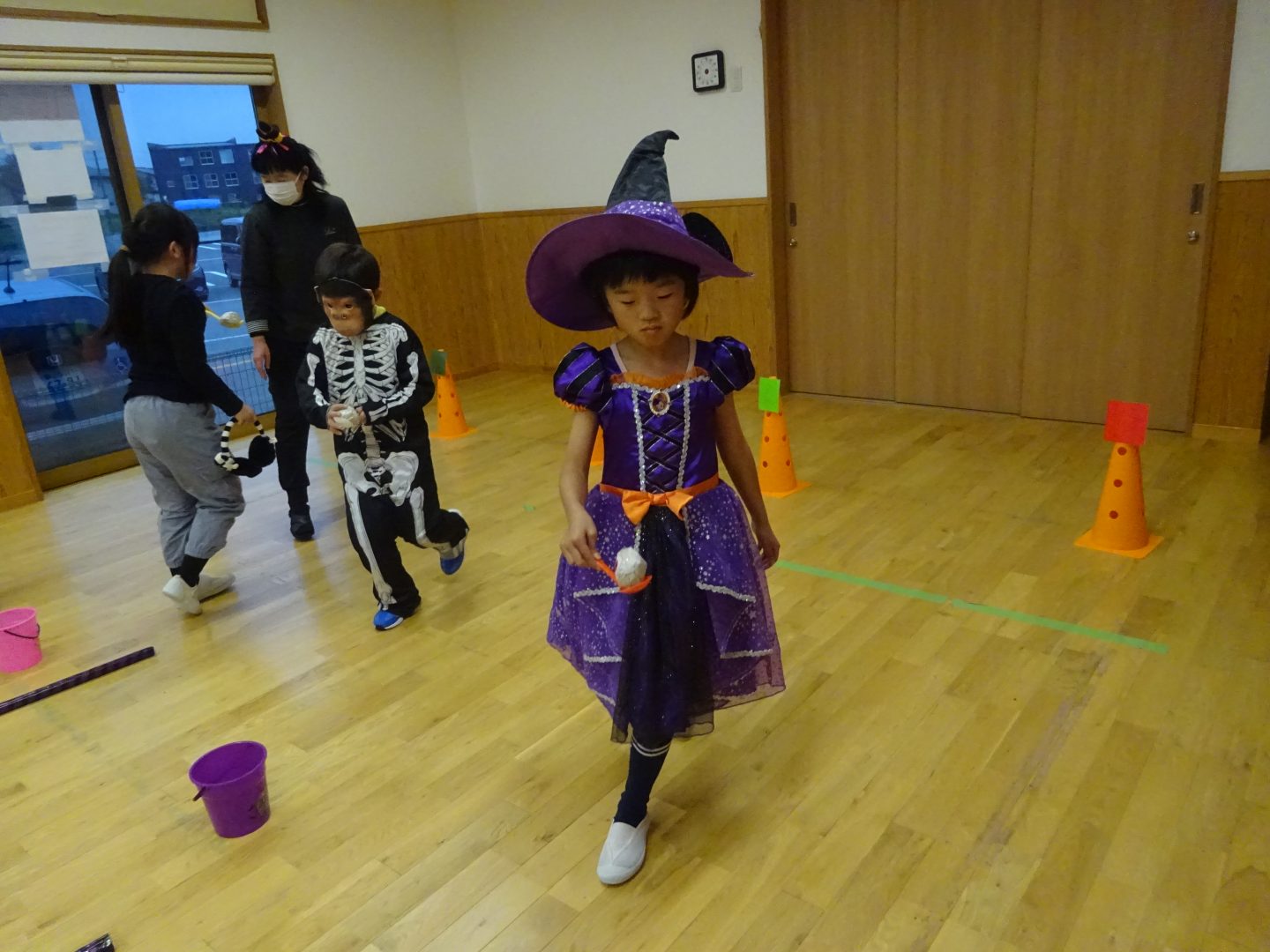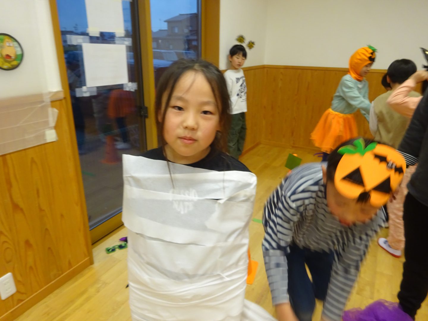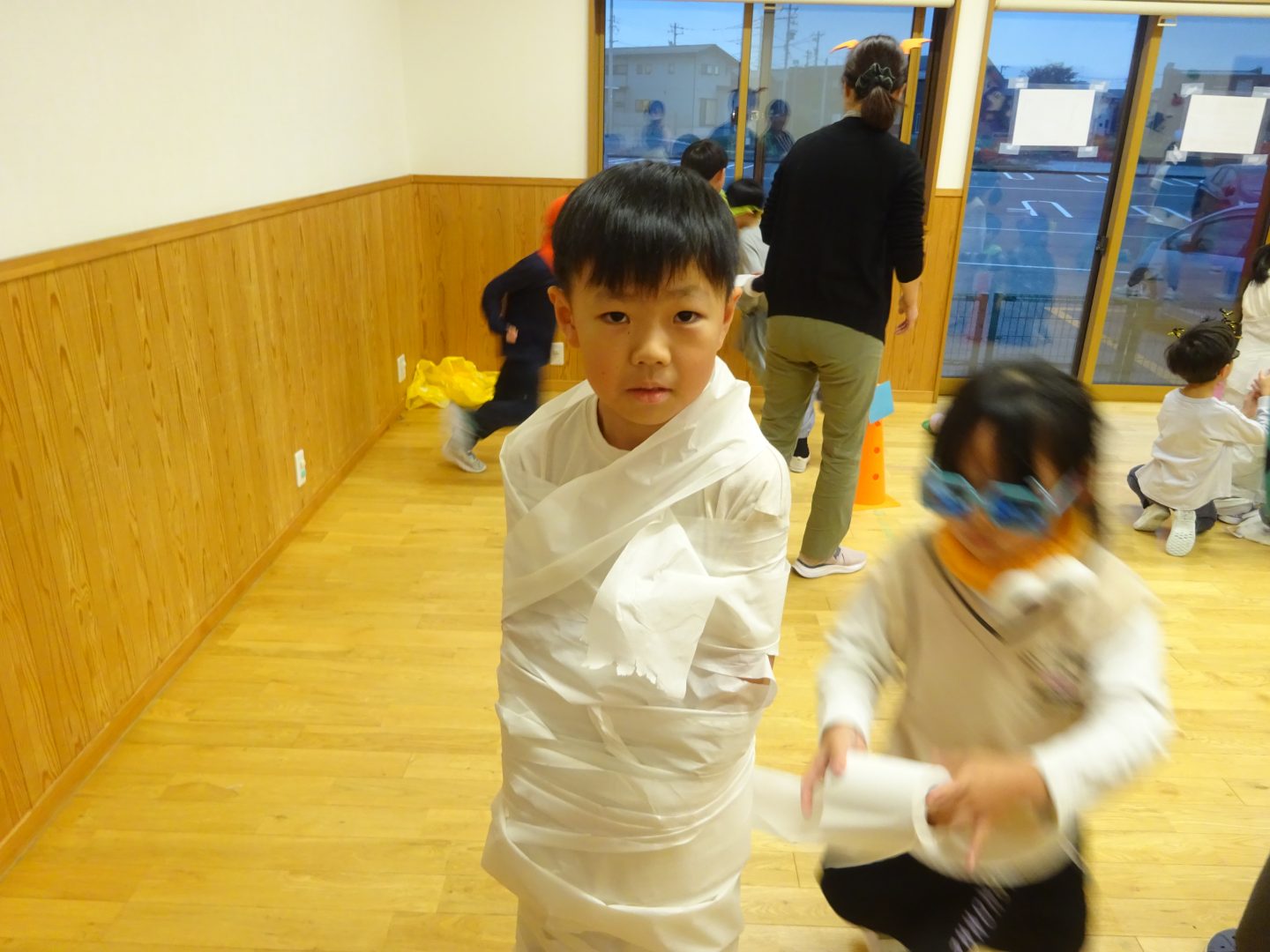 キッズクラブの恒例になっている【ミイラ巻きゲーム】や【魔女のほうきリレー】をして楽しみました。リレーは、