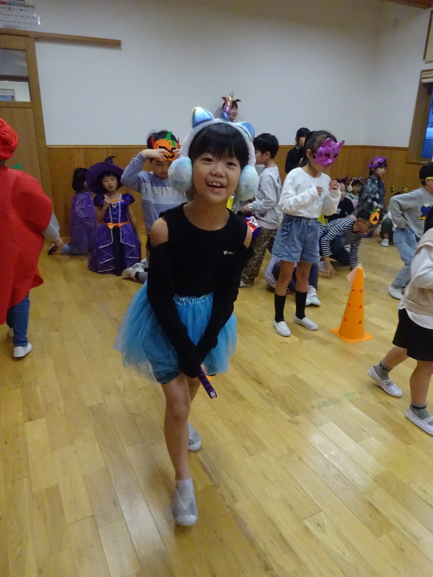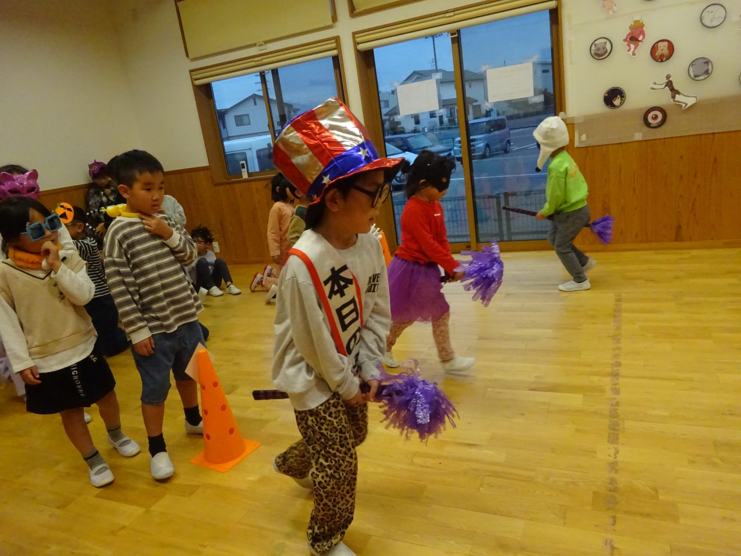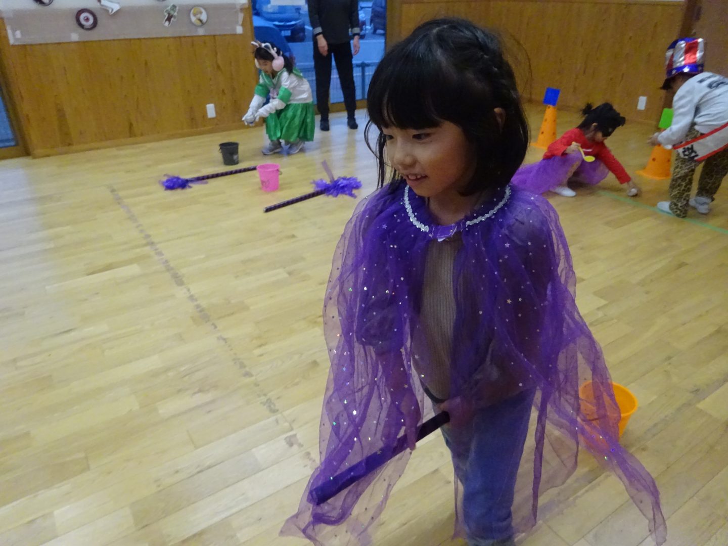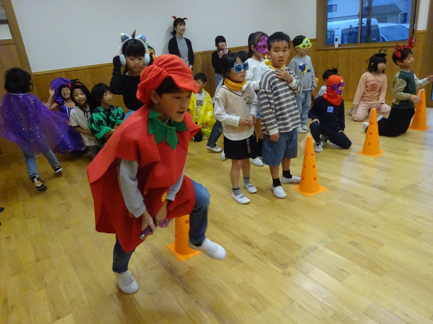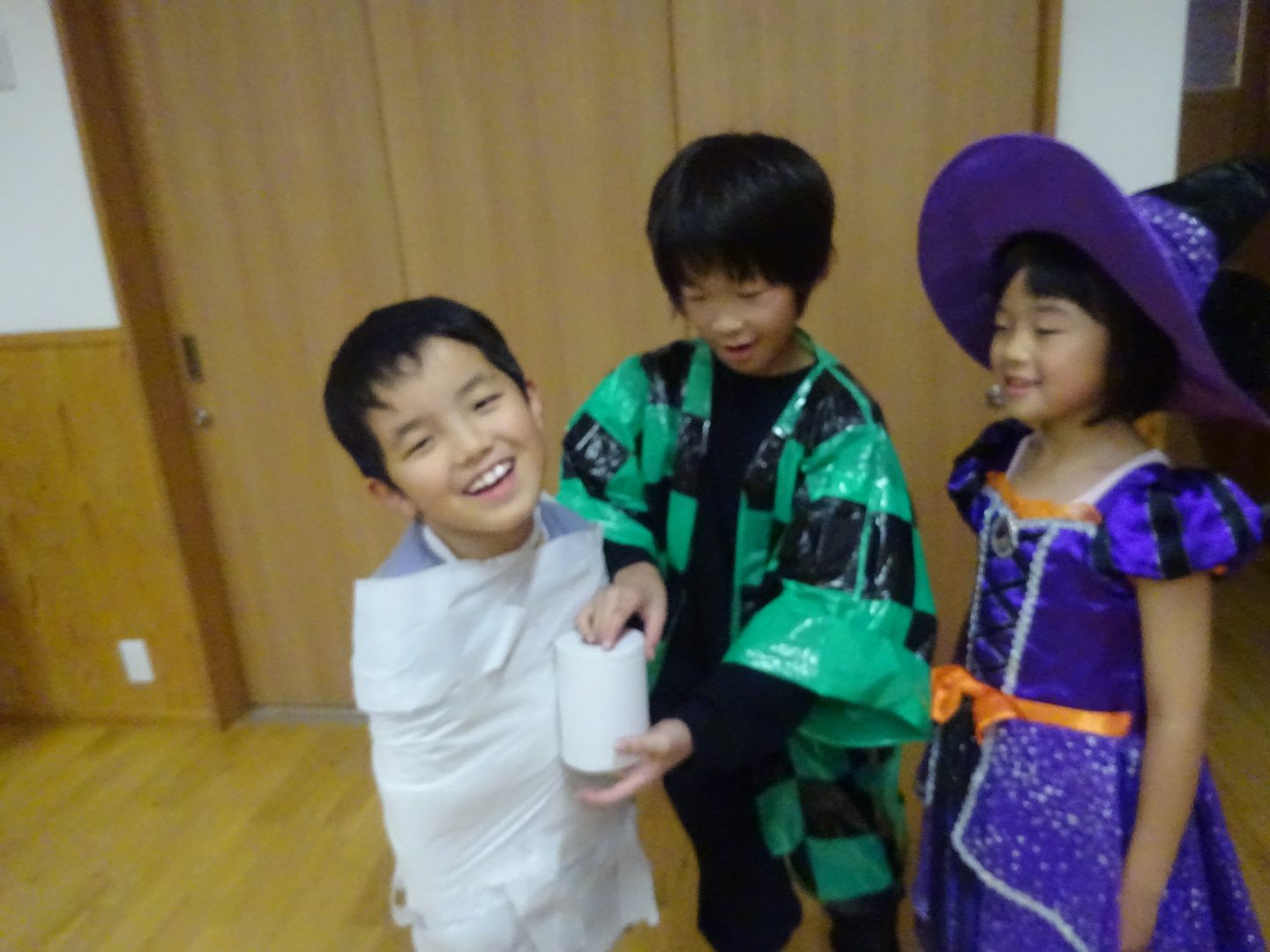 キッズクラブの恒例になっている【ミイラ巻きゲーム】や【魔女のほうきリレー】をして楽しみました。リレーは、