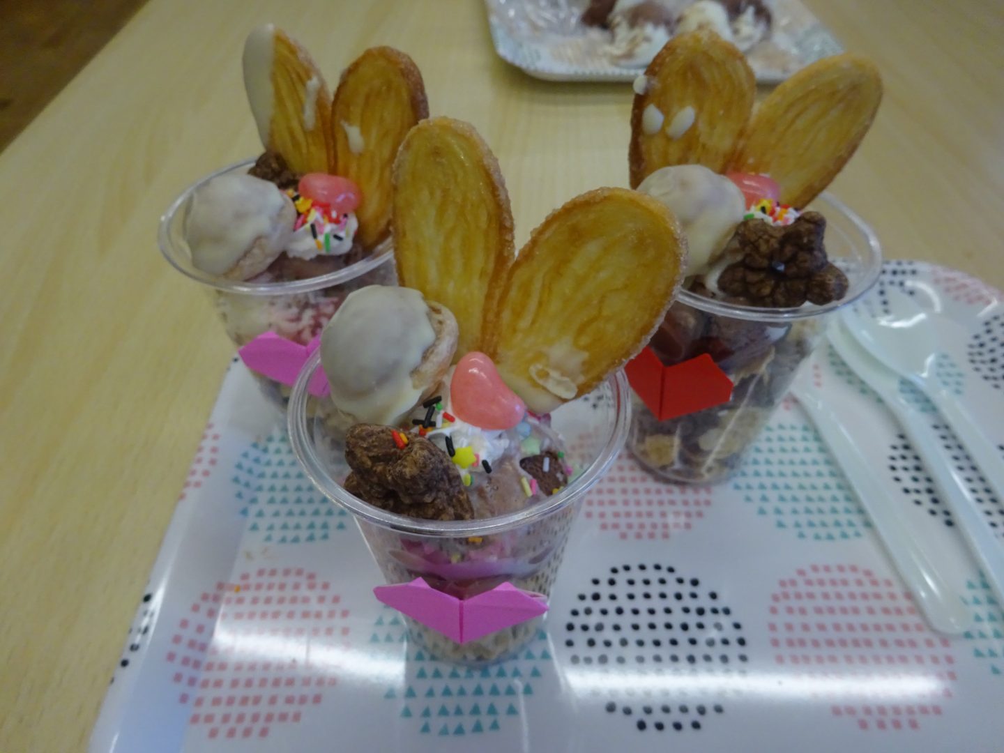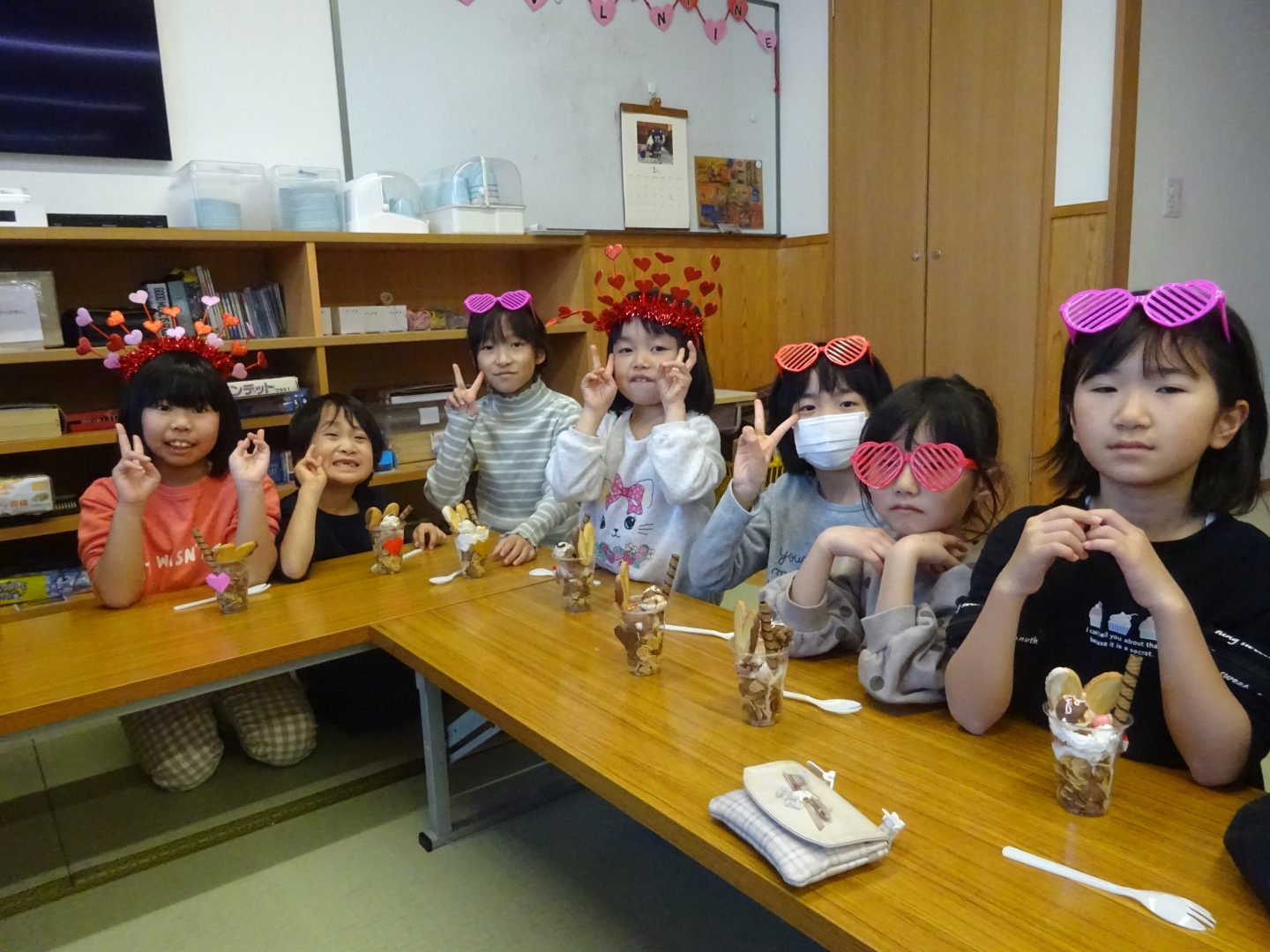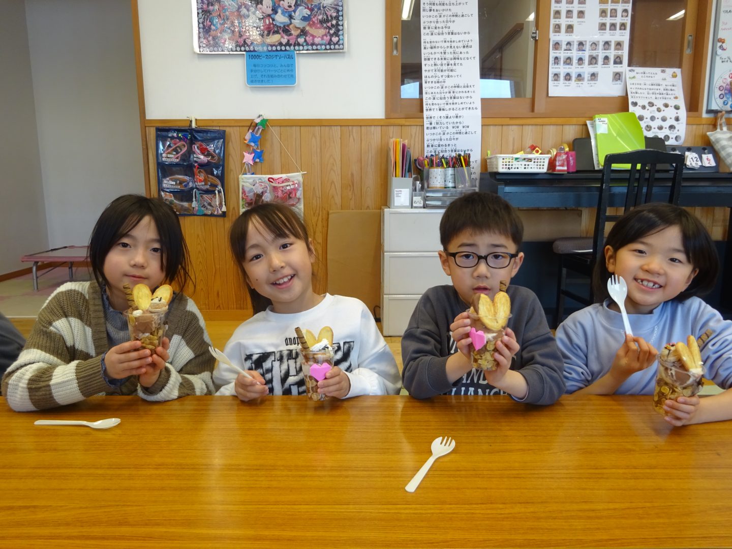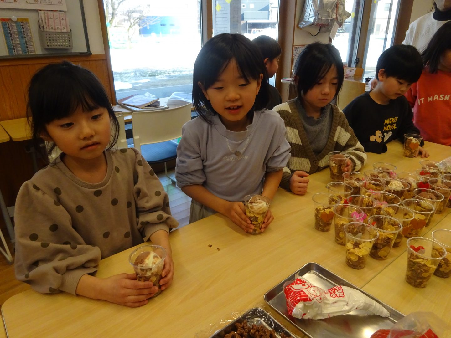 2月12日(木)、バレンタインにちなんで”パフェ作り”をしました。フレークが入った透明カップに、アイスをのせて、自分の好きなお菓子を選んでトッピングしました。鈴カステラをチョコでコーティングしたものに、アラザンや、グミなどをデコレーションして、オリジナルのパフェが完成!「かわいくて、食べるのもったいない!」「家でも作ってみよう!」と、盛り上がっていました!事務室の先生にもお裾分け♡楽しいクッキングになりました。