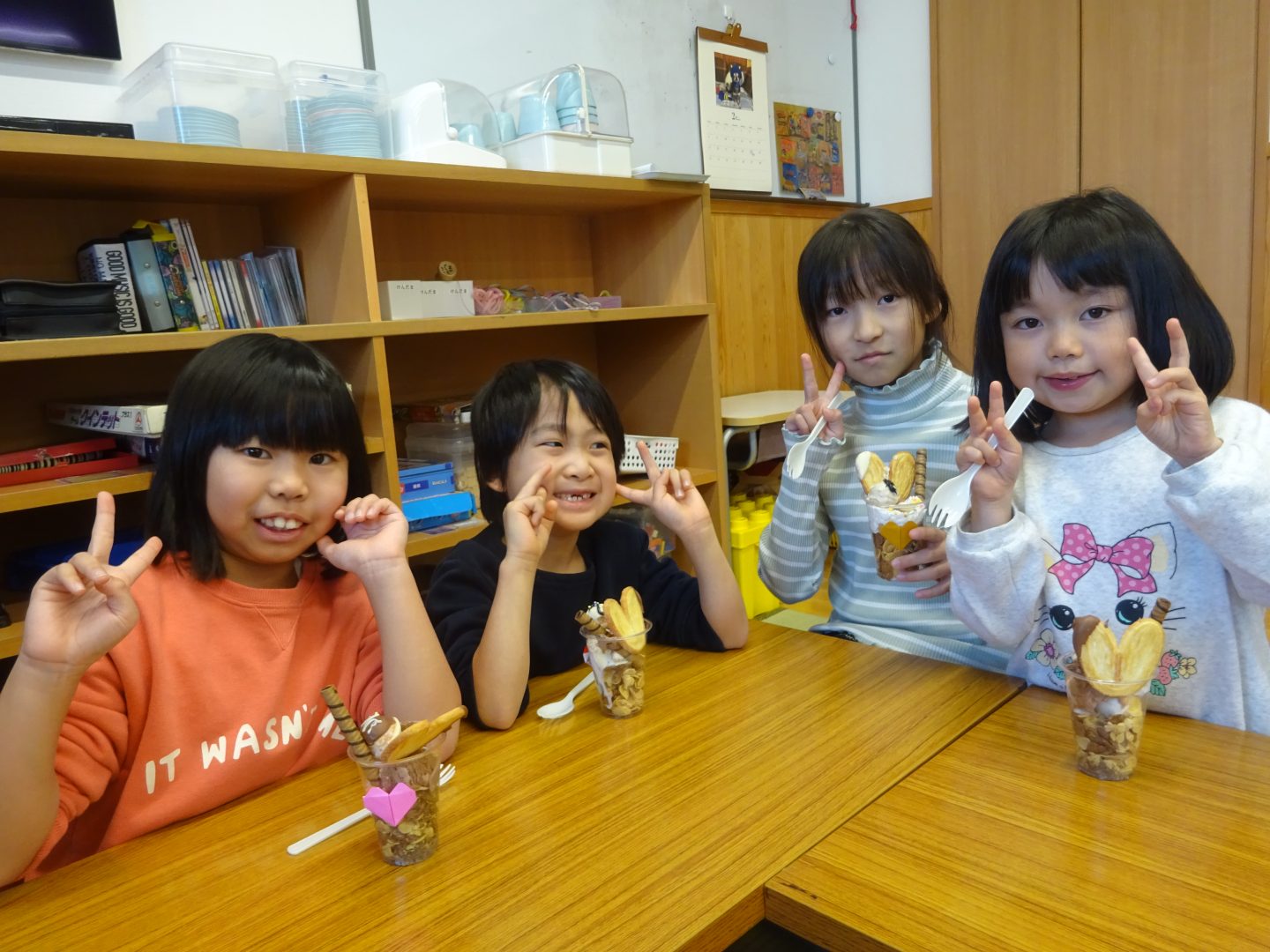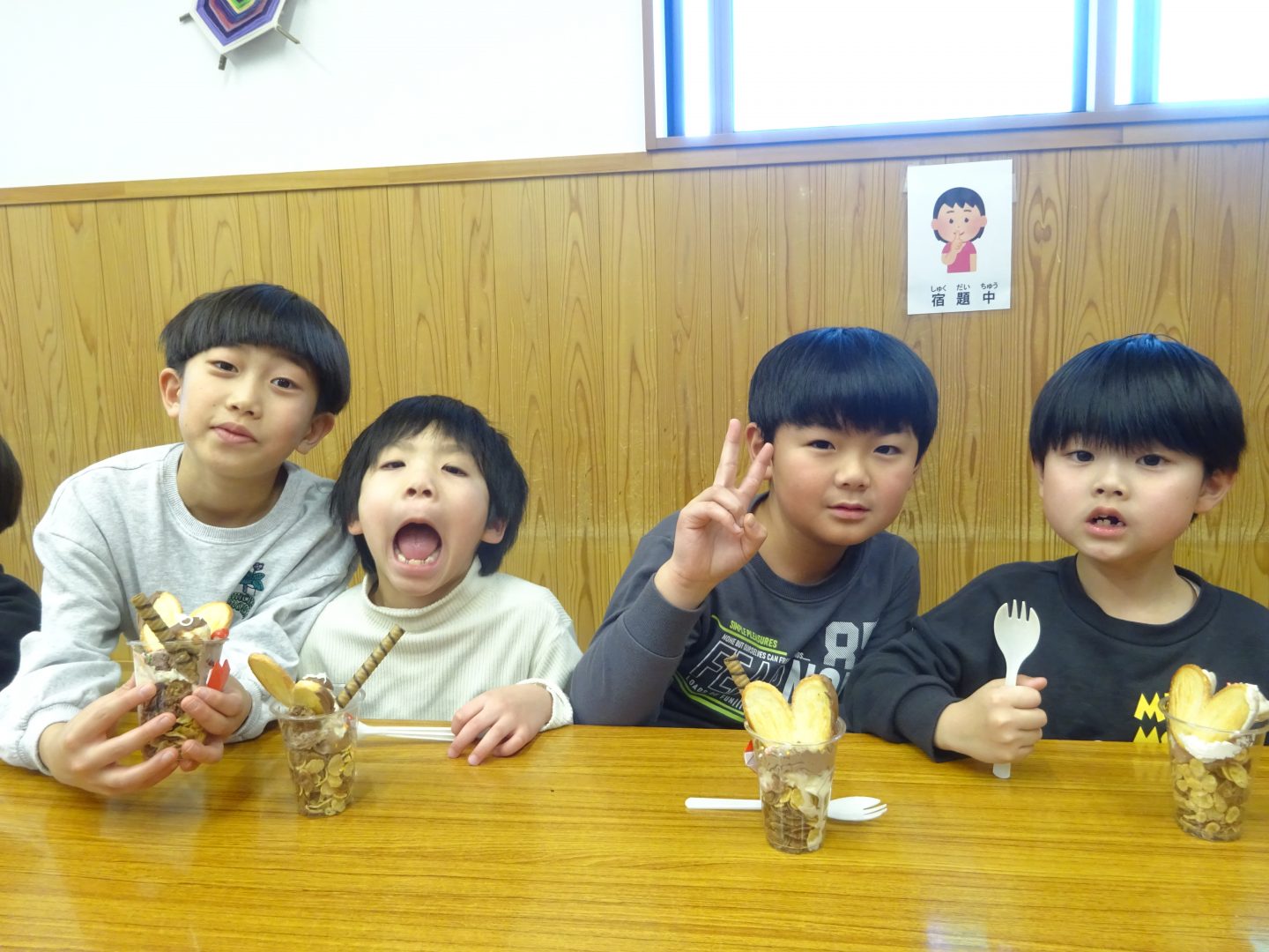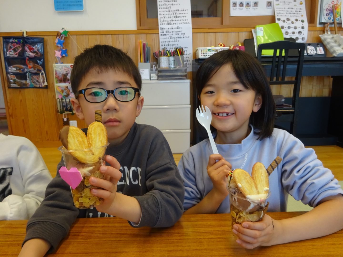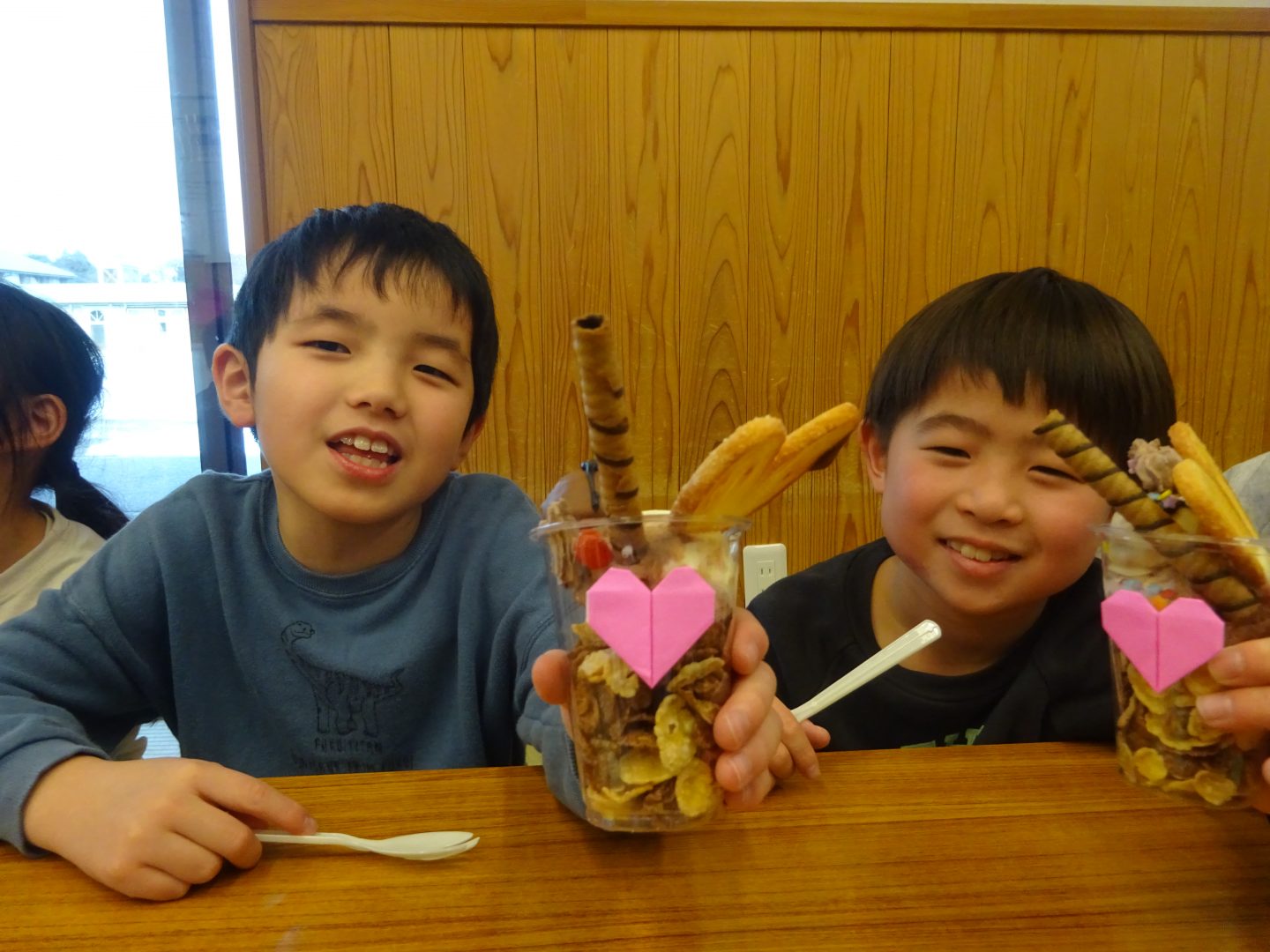 2月12日(木)、バレンタインにちなんで”パフェ作り”をしました。フレークが入った透明カップに、アイスをのせて、自分の好きなお菓子を選んでトッピングしました。鈴カステラをチョコでコーティングしたものに、アラザンや、グミなどをデコレーションして、オリジナルのパフェが完成!「かわいくて、食べるのもったいない!」「家でも作ってみよう!」と、盛り上がっていました!事務室の先生にもお裾分け♡楽しいクッキングになりました。