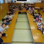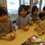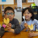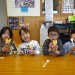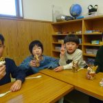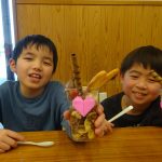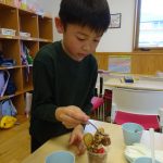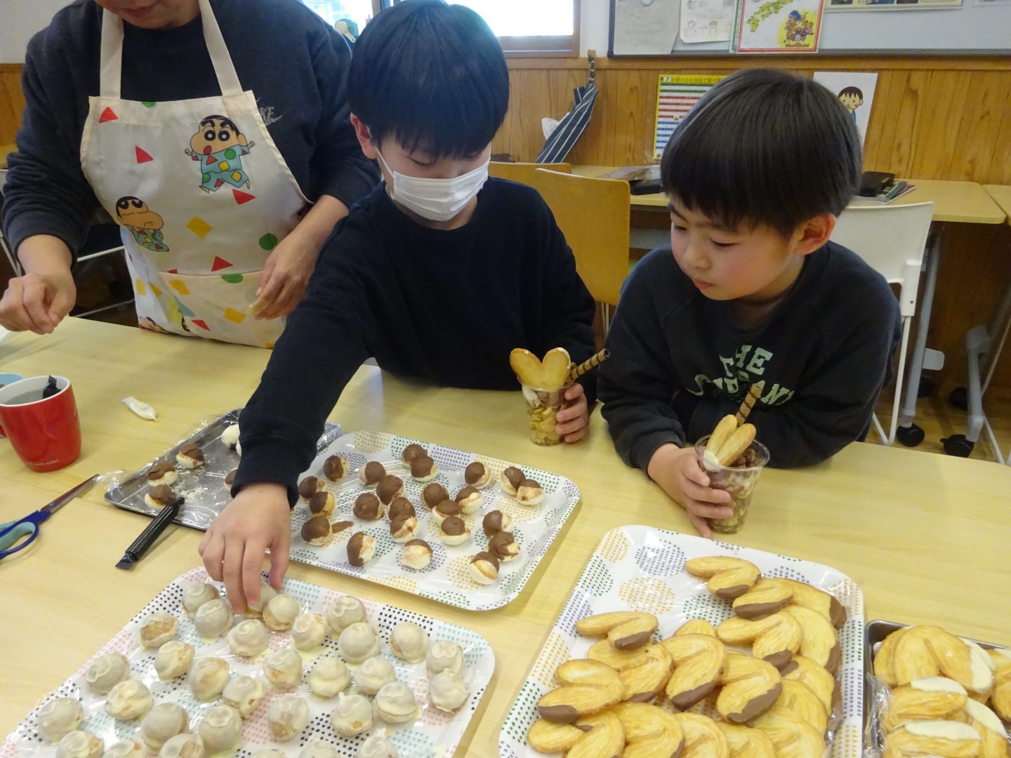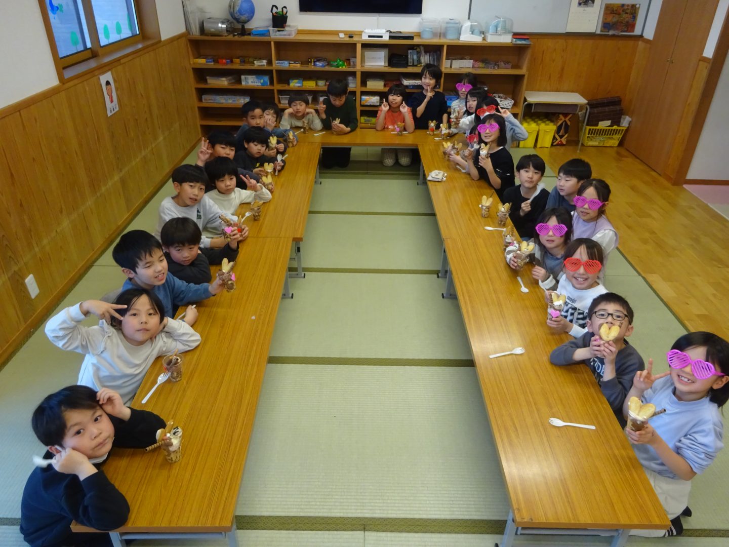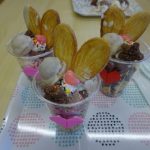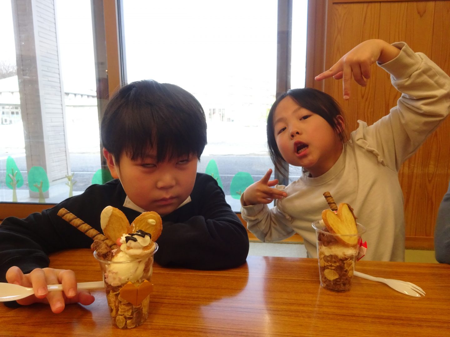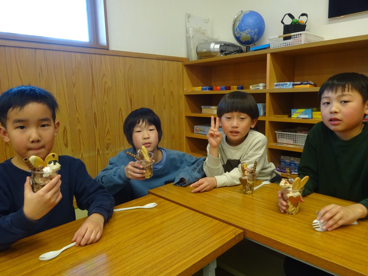2月12日(木)、バレンタインにちなんで”パフェ作り”をしました。フレークが入った透明カップに、アイスをのせて、自分の好きなお菓子を選んでトッピングしました。鈴カステラをチョコでコーティングしたものに、アラザンや、グミなどをデコレーションして、オリジナルのパフェが完成!「かわいくて、食べるのもったいない!」「家でも作ってみよう!」と、盛り上がっていました!事務室の先生にもお裾分け♡楽しいクッキングになりました。